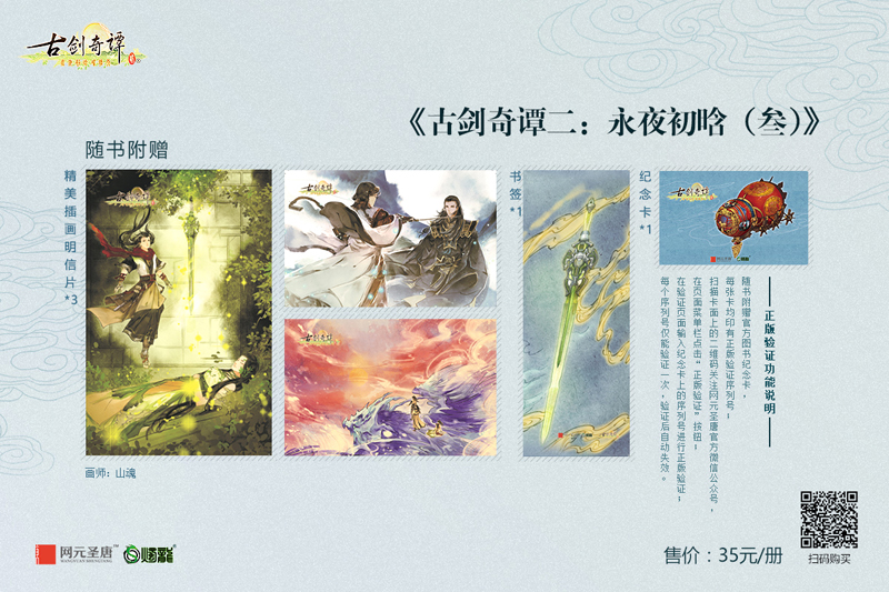 2017年10月17日,网元圣唐旗下上海烛龙自主研发的《古剑奇谭》系列单机游戏《古剑奇谭二:永夜初晗凝碧天》官方剧情小说——《古剑奇谭二:永夜初晗》三部曲完结篇,纸质版图书全渠道上市,发行渠道涵盖地面书店、网络书店,电子版图书在QQ阅读同步上市。 网元圣唐天猫商城购买 >>https://detail.tmall.com/item.htm?spm=a220z.1000880.0.0.iOnKbF&id=559984543857<< 《古剑奇谭二:永夜初晗》三部曲主线剧情与游戏基本一致,同时,小说新增不少细节,为故事注入了更多新鲜感。 还原游戏剧情,演绎问道主题 《古剑奇谭二:永夜初晗》三部曲全景式展现了游戏的主线剧情:精擅偃术的开朗少年乐无异,因机缘离家远行,邂逅了百草谷天罡闻人羽、太华山弟子夏夷则,以及身世神秘的美丽少女阿阮。四人在奇异的命运中聚首。踏遍万里山河,穷尽碧落黄泉。所思所求终于触手可及,而命运又将给出怎样的答复? 该剧情基于古剑系列宏大完整的世界观,有别于系列第一代作品《古剑奇谭:琴心剑魄今何在》的“重生”主题,二代作品以“问道”为主题。该主题不仅涉及主角团中每个成员的个人成长,而且关乎每个角色的内心挣扎与抉择。 “人都是很固执的,尤其在选择要走哪条路时更是半点不能强求,你最想要什么,就去做什么,那就是你自己的道。”游戏中谢衣的这句话,很好地诠释了这个人物对“问道”的解读。 携手知名作者,雕琢精彩故事 《古剑奇谭二:永夜初晗》小说三部曲由国内新武侠代表作家凤歌执笔撰写,以其独具特色的笔调,生动再现了原著游戏中的各色景象及精彩故事。同时,凤歌具有多年撰写武侠文学的经验,通过其老道的文笔,大大丰富了游戏中原有的战斗情节,使游戏中的打斗场面跃然纸上。 小说故事原案由《古剑奇谭二》游戏企划蘑尼拔提供,原著中宏大的世界观背景及跌宕的故事情节为小说撰写提供了坚实的改编基础。通过游戏与文字这两种不同文化载体的结合,《古剑奇谭二:永夜初晗》小说将为大家带来一段精彩的文学之旅。 进入《古剑奇谭二:永夜初晗》小说专题了解更多详情 >>http://gjqt.wangyuan.com/zt/novel2/index.html<< 精美装帧设计,创意体验俱佳 《古剑奇谭二:永夜初晗》小说三部曲纸质版图书装帧设计独具匠心,折叠的外封富于创意性,三部小说的外封展开后分别是三张不同的海报,展现了流月城、太华山、禺期铸剑的宏大场面。内封为云纹白底,还原阅读本质。书籍的装订方式为线装裸书脊,可以180度平摊翻阅,给读者更完美的阅读体验。全书的用纸皆为环保无公害纸张,轻便而极具质感,内文用纸的白度柔和,不伤眼睛。 不仅如此,每一部纸质图书,都随书赠送一张书签与三张精美手绘明信片,明信片插画内容皆为原著中经典人物与场景。 另外,三部曲每本书都将附赠一张网元圣唐图书纪念卡,除用于收藏纪念之外,读者还可通过卡面上的提示进入网元圣唐官方微信,使用纪念卡上的序列号进行正版验证。为保证验证的真实性,纪念卡上的每个序列号仅限验证一次,验证成功后,序列号即失效,不支持重复验证。 月冷千山,永夜将尽。烈血青锋,再书奇谭。希望《古剑奇谭二:永夜初晗》小说三部曲,会为玩家和读者带来愉快的阅读体验。 ——踏歌长行 梦想永在! 《古剑奇谭》系列官方网站:http://gjqt.wangyuan.com/ 《古剑奇谭》系列官方微博:http://weibo.com/gujianqitan/ |