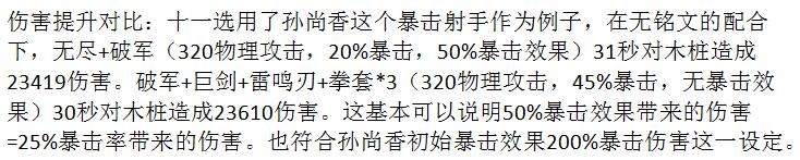 在王者荣耀中暴击可以说是一个bug的属性,只存在于物理系单位中,法术除了闪电匕首的被动可以暴击,其他的一概不可以。围绕暴击有两大属性,一个是暴击效果,一个则是暴击几率。这两个属性到底哪个提升的伤害高呢?
