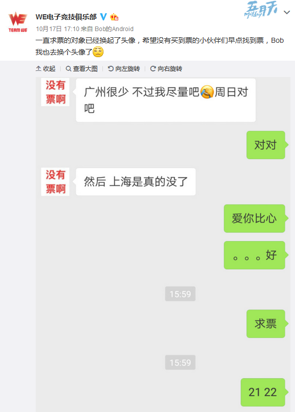 去总决赛现场为自己喜欢的战队呐喊打CALL应该是每一个资深LOL玩家最大的理想。今年S7赛事是在中国举办,所以中国的玩家也是格外热情。不过大多数网友都在抱怨“门票太难抢了,根本抢不到啊!”更有网友发微博称“锁座了不给我付钱,可能这辈子都看不到LOL的现场比赛了,绝望。” 目前半决赛的门票已告罄,没有抢到票的玩家们纷纷向LOL圈大佬求助,但各位大佬也表示爱莫能助,因为他们也没有票。 草莓前几日更是在微博之言“认识的朋友里面没有一个买到S7门票的,感觉一大半门票都在黄牛手上。” WE战队的官博人员面对粉丝的求助也很无奈,换上了“没有票啊”的图片作为头像,让人哭笑不得。 在淘宝上,上海赛半决赛的前排票已经卖到了3800元,而且从销量和评价来看,这些高价售卖门票的店铺已经进行了不少的交易。原本是LOL游戏玩家的盛会,已经成为了黄牛谋取暴利的渠道。 一些海外的观众也想来中国观看S7总决赛,但是就连中国本土的玩家费尽心力却抢不到一张票,更别网络延迟更高的国外了。买票网站的各种崩溃以及门票售空的速度吓坏了国外玩家。更有国外的玩家在知名的Reddit的论坛上发布了一篇名为《Disappointed with Worlds Ticket Sales》(对世界赛门票销售感到失望)的帖子,被国外网友顶到了4500多贴。 黄牛的态度简直像在说:“我,黄牛,打钱!”真正观众的权益却得不到保障。如今只有等待官方做出调整,还大家一个公平买票机会。 |