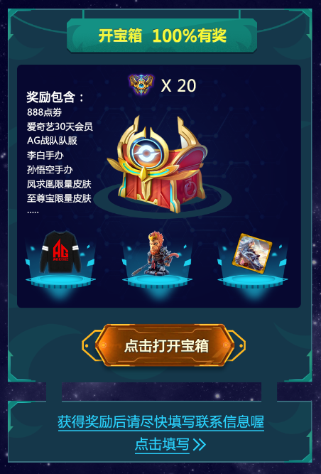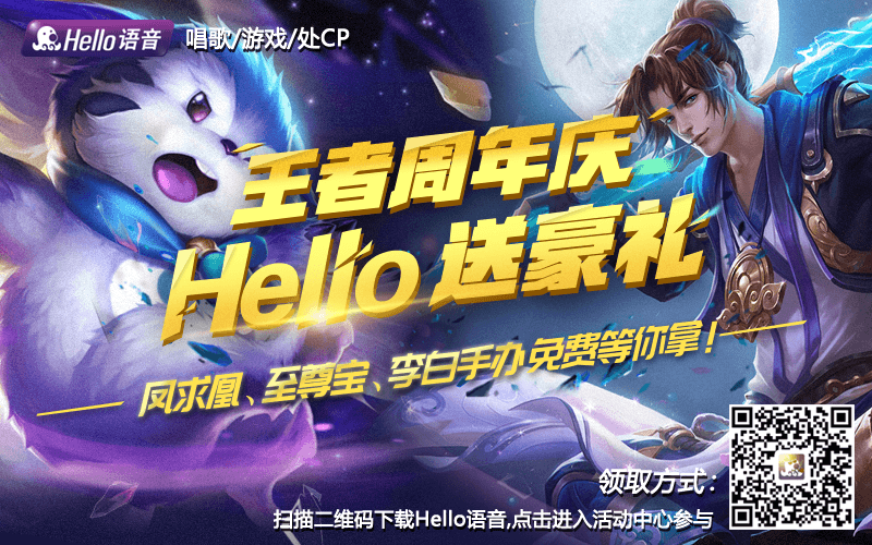 作者:Hello君 不知不觉,《王者荣耀》也要过周年庆啦!在过往一年的浴血奋战中,各位召唤师们是否取得了自己想要的成绩呢? 既然敌军下一秒就要推到高地,那么Hello君赶紧先把正事说了——凤求凰、至尊宝免费送,就在Hello语音哦! 【新老用户皆有份 每日任务换徽章】 (1)所有用户每日登录可获得一次抽奖机会(每日限1次)。 (2)所有用户每日分享图片可获得一次抽奖机会(每日限1次)。 (3)所有用户成功邀请新用户注册可为双方各增加一次抽奖机会,点击“获取抽奖机会”填写被邀请人的Hello ID即可(每日最多可邀请3位行朋友哦)。 (4)活动时间:10月26日-11月5日 【抽奖得徽章 徽章开宝箱】 召唤师宝宝们注意咯,活动过程中每集齐20枚徽章即可开启1次宝箱!每个用户最多可开启5次宝箱。 点券、视频会员、战队队服、限量手办、限量皮肤,比拼手气的时候到啦,100中奖率,每次开箱都有惊喜,你会抽到哪一款呢? 重要的事情说三遍—— (1)获得手办和队服的宝宝请仔细填写QQ号,Hello语音工作人员会在7个工作日内联系你寄送实物奖品。 (2)获得了其他奖励的宝宝请仔细填写支付宝和支付宝认证姓名,奖励将会以支付宝转账的形式发放到你的账号。 (3)更多问题请加入活动群:咨询了解。 【转发微博 钻石金币等你拿】 关注Hello语音,转发此微博并写明自己的Hello ID,Hello君将会从中抽取20位宝宝,发放520钻石和1314金币! 微博转发时间:10月27日-10月29日。 更多精彩正在路上……拿起手机,进入Hello,与新老朋友一起赢取豪礼吧! |