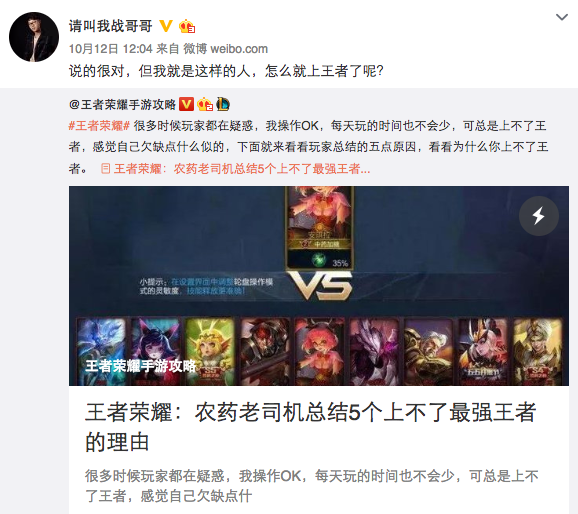 相信每一位王者荣耀的玩家每天投入了大量的时间与精力于大峡谷当中,也有去学习各种攻略以及教程的,只为一个王者梦。但似乎有时候努力与成果并不会成正比,似乎许多玩家在自认游戏水平已有不错的提升后,却依旧迎来一阵又一阵的死亡界面。 对于这样的现象,有许多游戏玩家总结了“5个上不了最强王者的理由”一文,里面便提及到“永远失去理智、性格太冲、不够果断、觉得自己可以carry全场、没有大局观”五个主要理由。文章基本上刺中了许多游戏玩家的痛点,却基本是对“神奇的队友”与“奇葩的对手”的各种吐槽,对上述的问题深有感受。 当然,除了战哥哥。有着国服第一李白之称的战哥哥阅读此微博后,转发直言“说的很对,但我就是这样的人,怎么就上王者了呢?”熟悉战哥哥的直播都清楚主播一向奉行“不要怂就是刚”的游戏风格,以一手近百胜率、高熟练度的李白以及自身过硬的实力,“浪”出一片天,能够很快地打出巨大优势。 至于普通玩家与主播的技术差距嘛,还是存在较大差异的,因此尚在艰难上分的玩家依然需要检讨自身是否存在这些通病,提升游戏技巧,早日领略王者的无限好景! |