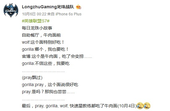 随着《英雄联盟》S7半决赛落幕,SKT与SSG这两支晋级总决赛的队伍也即将在鸟巢开启“LCK秋季总决赛”。在昨日抵达后,SKT战队官方推特发布了队员们抵达北京的动态。 但尴尬的是,在到北京之后,SKT全体成员居然第一时间去品尝了所有职业选手最害怕的东西——海底捞! 相信对于“海底捞”这个梗大家都不会陌生,在小组赛时曾经一度被所有人认为是夺冠大热门的龙珠战队不信邪曾经挑战过一次,后面的结果相信大家都知道了... 甚至还有网友表示:后面这个服务员的微笑,越看越像安掌门... 在不久后举行的总决赛中,我们就能看到世界第一强队和海底捞的真正对决了。究竟是SKT技高一筹,还是“海底捞魔咒”持续发威?让我们拭目以待吧! |
