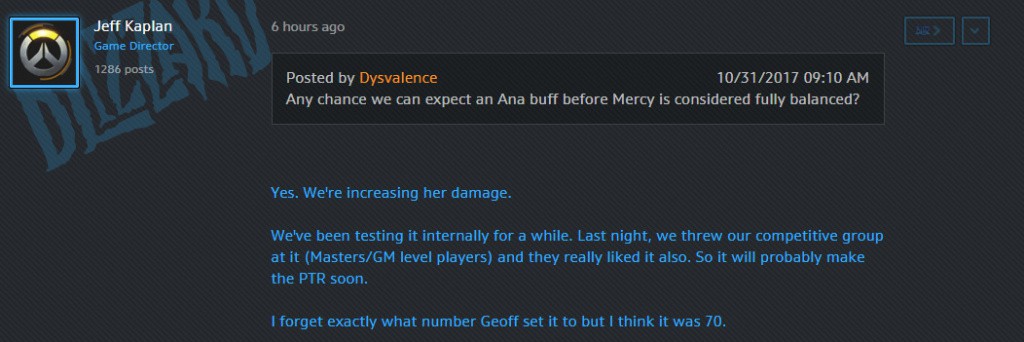 《守望先锋》总监Jeff在最近和论坛玩家的互动中又透露了一些《守望先锋》在未来调整、改动的方向。其中包括了对安娜的加强、天使的技能以及半藏的皮肤问题。 继《守望先锋》将天使重做,加强了输出能力之后,Jeff决定向另一个辅助位英雄动手了,这次的目标是安娜。Jeff在论坛的回复中称,将马上在PTR中上线一个修改,增加安娜的输出能力。 在面对天使复活技能将再次削弱的问题时,Jeff称对天使的改动是一个反复迭代的过程。总的来说现在的天使要比以前更加充满活力,更加有趣,越来越多的人开始喜欢上了这个英雄。我们不想让天使成为一个只能藏在桥下对队友说死在一起的英雄。天使的首要工作是治疗,其次是机动性,我们不想她专注于复活。 Jeff还对匹配系统进行了解释,称《守望先锋》的匹配系统绝对不会由恶意操纵的情况,希望玩家们别再疑神疑鬼了。Jeff还称,原来许诺的半藏的两个传说皮肤已经在做了,你们在等会吧。 |