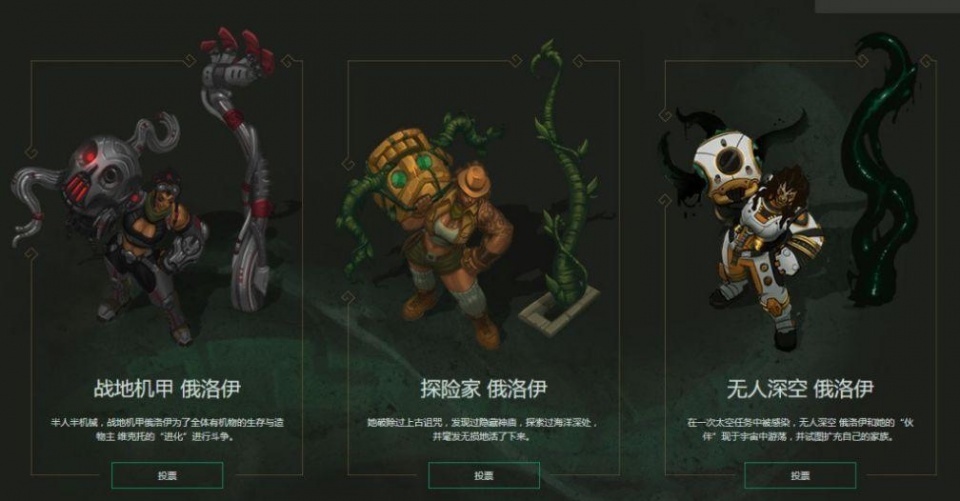 相信玩《英雄联盟》的小伙伴都知道,在游戏中不同英雄拥有的皮肤数量也不同,甚至有不少英雄从推出至今一直只有最初的那款皮肤,这也让喜欢这些英雄的玩家非常苦恼,但现在拳头似乎有意打破这一现状。近日,拳头公布了三款海兽祭司——俄洛伊的皮肤原画,并且表示将根据玩家们的投票数量来决定最终推出哪一款。 以下为这三款皮肤曝光的原画: 战地机甲-俄洛伊 探险家-俄洛伊 无人深空-俄洛伊 这三款皮肤各有不同的风格,而且都属于目前游戏中已拥有的系列皮肤。不过根据官方表示,这三款皮肤最终只会推出玩家投票数量最高的哪一款。究竟最终哪一款皮肤会留下?让我们拭目以待吧! |
