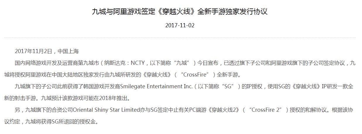 国内网络游戏开发及运营商第九城市(以下简称“九城”)今日在官网宣布,旗下的合资公司Oriental Shiny Star Limited与SG签定中止有关PC端游《穿越火线2》(“CrossFire 2”)授权的和解协议。根据该协议约定,九城将获得SG所退回的授权金。 2015年时,九城宣布旗下公司代理《穿越火线2》,当时的协议中约定,九城的合资公司将首付5000万美元,其后根据游戏相关运营和开发情况进行总额为4亿5000万美元的付款(一共5亿美元,约合31亿人民币)。 此外,官方还透露已透过旗下子公司和阿里游戏旗下的子公司签定协议,九城将授权阿里游戏在中国大陆地区独家发行由九城所研发的《穿越火线》(“CrossFire”)全新手游。 九城旗下的子公司此前获得了韩国游戏开发商Smilegate Entertainment Inc.(以下简称“SG”)的IP授权,使用SG的《穿越火线》IP研发一款全新的射击手游。官方预计该款游戏可能在2018年推出。 |