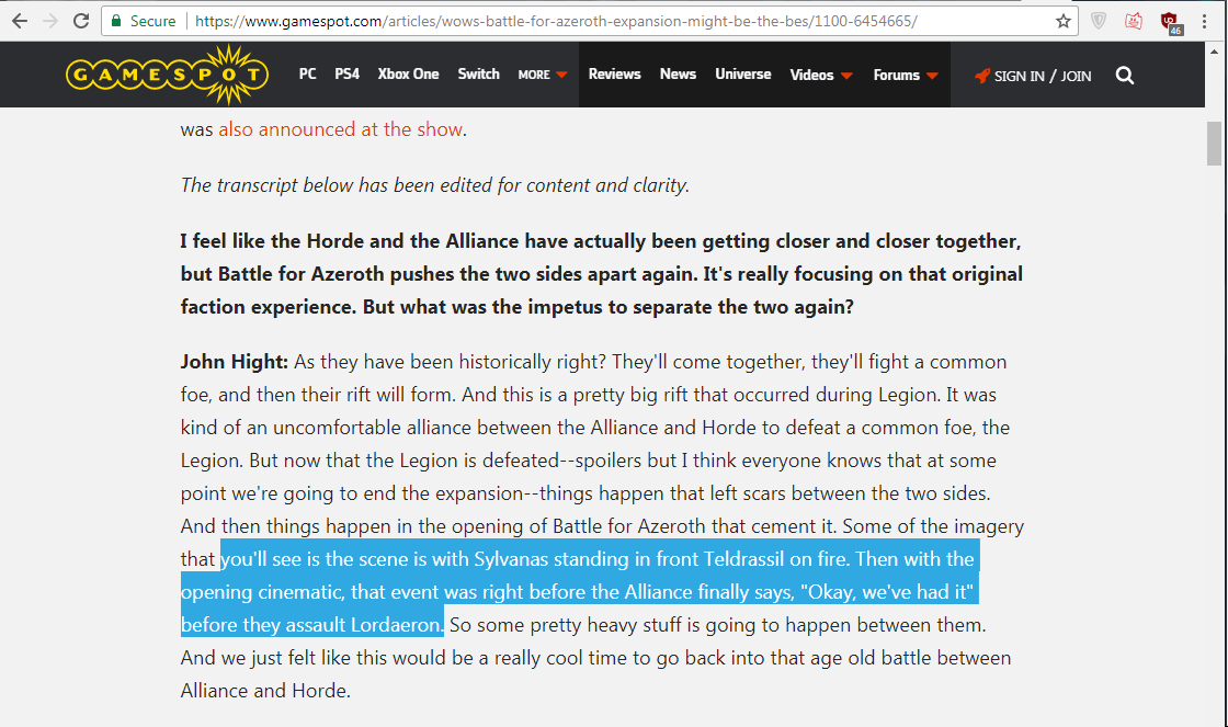 在第一场座谈会上放这两张图的时候,其实他是这样说的: “看了开场动画以后,肯定有人想问我:‘为什么联盟要打洛丹伦?’” “这是个好问题,但我给你们准备了一个更好的问题:‘为什么部落要烧了泰达希尔?’” 然后他放出了这两张图,台下一片哗然。 “是泰达希尔先倒,然后导致了联盟对洛丹伦的进攻……………………吗?” “还是说烧泰达希尔其实是针对联盟对洛丹伦的大胆攻击的报复?” “你们会知道答案的。” 然而他不说架不住其他人说。紧接着就有一大批的访谈。 总监John Hight: “你们会看到希尔瓦娜斯站在燃烧的泰达希尔前面的场景,然后是开场动画。正是在这个事件后,联盟最终说:‘好的,我们受够了’,然后攻打了洛丹伦。” 了解更多相关信息,请前往http://wow.yzz.cn/ |