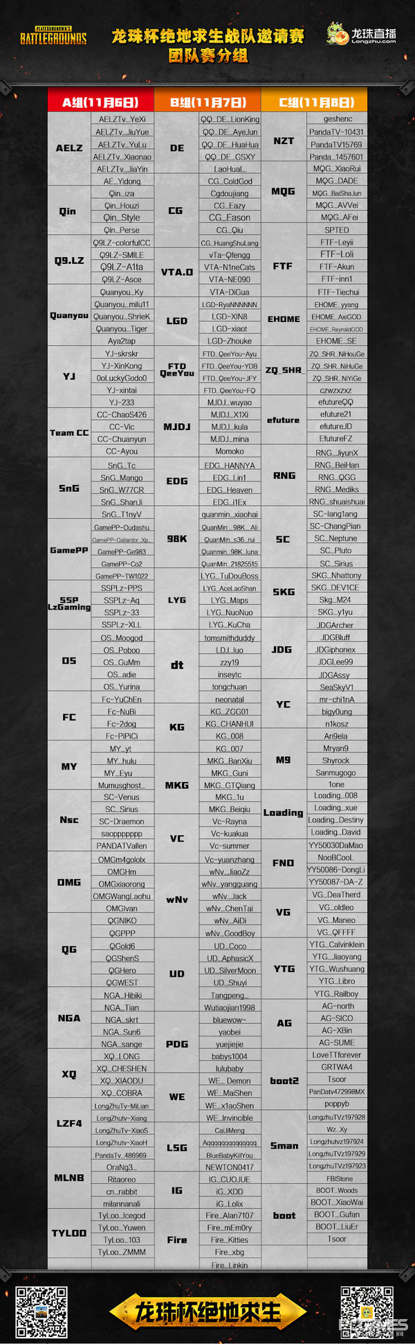 由龙珠直播举办的龙珠杯绝地求生战队邀请赛B组的比赛于11月7日下午14:00正式开打。本届比赛,邀请到老牌一线俱乐部的PUBG战队,LGD、wNv、VG、WE、OMG等顶级中国电子竞技豪门俱乐部都将参与其中。包括四人团队对抗赛、单人solo赛,届时总计有60支战队将会投身其中,一较高下。 B组则堪称死亡之组,云集了LGD、EDG、wNv、IG、WE等诸多老牌豪强。第一场比赛,不少战队因载具遭引爆被淘汰,VTA战队依靠强有力的团队协作占领制高点最终击败QuanMin战队成功吃鸡! 第二场FTD决赛圈全歼水鬼但遭遇了Fire战队的独狼干扰无缘吃鸡。EDG面对MKG攻楼、LYG卡位依然顽强战胜对手并依靠载具为掩体反击FTD战队最终成功吃鸡! 第三场比赛机场圈加快了游戏节奏。堵桥大战一触即发, QQ、 EDG、 QuanMin战队上演博弈。最终决赛圈刷在机场悬崖边,各战队展开大乱斗,FTD战队以高强度的配合与执行力,在占据天命圈的优势下成功吃鸡! 在11月8日,我们将为大家带来C组的精彩比赛,还请各位千万不要错过! 直播专题地址 分组信息 |