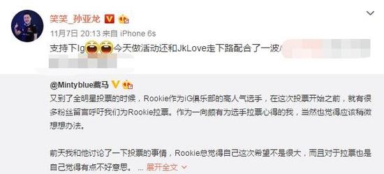 近日,LOL全明星的票选活动实在太激烈了,尤其是中单位置,从今天下午开始Rookie和Xiye轮流坐第一。可以说,这一次基本上是WE粉丝和IG粉丝的对决。 一开始,两支LOL战队的老队员纷纷开启了拉票模式,尤其是WE的微笑:早起的一天从拉票开始,2017全明星投票希望各位乡亲父老宝宝兄弟们来给WE。旺仔投一票,这几年看着兮夜一路的成长,现在也是能在中单的位置独当一面吧,希望大家可以给这个小朋友展现自己的一次机会 。 而IG的老队员笑笑也为IG摇旗呐喊:支持一下IG,今天还和Jklove走下路配合了一波。 接着,战队的高层也纷纷加入战局,王思聪一马当先:为我们可爱的Rookie拉个票! 而WE的老板,也不遗余力,虽然平时哭穷,但是一到紧要关头居然肯撒钱了,不容易不容易! 不过,相比大佬们的拉票,下面粉丝的拉票就相当惨烈了,简直是捋起袖子干架。尤其是WE有一名粉丝这样说,简直丧心病狂:我们没有王思聪有钱,只能靠自己!并且暗指Rookie有心机,嘴上说不想去,其实很想去! 解说管泽元转发了IG粉丝的拉票博文后,被网友吐槽,随后管泽元微博的评论区下一遍混乱,管泽元与黑粉对喷起来,并嘲讽:爱国贼!爱国贼! 了解更多相关信息,请前往http://lol.yzz.cn/ |