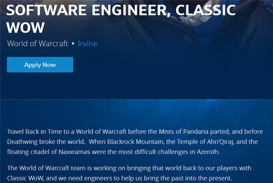 在今年的暴雪嘉年华上,暴雪官方宣布了制作《魔兽世界》怀旧服的相关消息。但截止目前怀旧服仍然处于开发状态,一切的工作都还尚未开始。 如果你现在登录暴雪招聘官网的话,可以看到这样两条招募信息: 招聘信息中写道:“当时光重回到潘达利亚之谜以前,回到死亡之翼毁灭世界以前,那时候的黑石山、安其拉神殿和纳克萨玛斯浮空要塞就是艾泽拉斯大陆面临的最大挑战。《魔兽世界》开发团队整致力于将经典旧世(60级版本)重现到玩家面前,因此我们需要软件工程师协助我们,把过去的世界带到现在。” 既然工程师都还没招到,这意味着怀旧服相关工作还未步入正轨。但以暴雪的效率来看,当人员齐备后肯定是会快马加鞭的进入制作。即使时间会比较长,但相信那些对旧时光充满怀念的玩家们也不介意多等一会。 了解更多相关信息,请前往http://wow.yzz.cn/ |