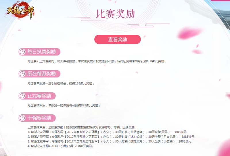 刀剑诗酒、快意江湖,《天龙八部手游》半周年庆典重磅开启,全新版本“圣火降临”携新门派、全新玩法以及海量福利同步登场。喜迎半年庆新版本,《天龙八部手游》2017年度帮派之花评选大赛也将在明日(11月16日)启动,寻觅金庸笔下的山茶朝露。海选赛期间,玩家可报名参赛竞逐帮派之花,赢取专属称号、时装、坐骑等丰厚奖励,也可以作为“赏花之人”为心仪的参赛选手投票,同样有一份礼物馈赠。 江湖有佳人 寻找帮派之花 在天龙八部原著小说中,金庸曾经不吝笔墨的去赞美王语嫣的美貌,其中就曾经以一段经典对比诠释了美人最高境界,那就是“前人云:‘梨花一枝春带雨’……可是梨花美则美矣,梨树却太过臃肿……只有像王姑娘这么,山茶朝露,那才美了”,因此多年来山茶朝露便成为金庸笔下对于美人的较高评价。此番《天龙八部手游》特别打造的2017年度帮派之花评选大赛,正是基于寻觅金庸笔下的山茶朝露的初衷,将在整个江湖内面向千千万天龙玩家征集评选,最终选拔出天龙年度帮派第一美人。 海选赛启动 我为美丽代言 即日起,《天龙八部手游》2017年度帮派之花海选启动,玩家可通过大赛页面进行报名。除了为美丽代言、争夺帮派之花荣耀之外,大赛还为优胜选手准备了丰厚的奖励。其中海选赛结束后,单服第一的参赛者可获得888绑元奖励,在正式赛结束后,全服票数前十的参赛者还可根据票数名次获得称号、时装、坐骑奖励。 女为悦己者容 投票支持心仪的TA 除了报名参赛之外,在海选赛和正式赛期间玩家也可以参与投票,从众多参赛选手中寻找到自己心目中的山茶朝露并为TA送上支持的投票。玩家每天都可以进行投票,单次比赛累计投票达到20票,待海选赛结束后还可以获得188绑元奖励。 《天龙八部手游》2017年度帮派之花海选启动。一花独放不是春,百花齐放春满园,在日渐寒冷的日子里,相信即将盛装登场的江湖佳人们,将让这个初冬瞬间暖成了百花争奇斗艳的春天。 关于《天龙八部手游》 金庸正版授权,《天龙八部》端游原班人马倾心打造,完美传承端游核心特色与经典玩法。游戏以Unity5引擎打造真实3D视觉盛宴,再现聚贤庄、珍珑棋局、琅嬛福地等知名场景,更有乔峰段誉王语嫣等英雄角色指点传世神功,四大经典门派,远攻近战、刺客治疗各具特色,珍兽神器、装备打造、自由交易玩法丰富,还有行酒令、运镖、凤凰古城等快意帮派玩法,营造出一个荡气回肠、快意恩仇的热血武侠世界,完美呈现金庸笔下最宏大的天龙江湖! 了解更多相关信息,请前往http://game.yzz.cn/html/info-5764.html |