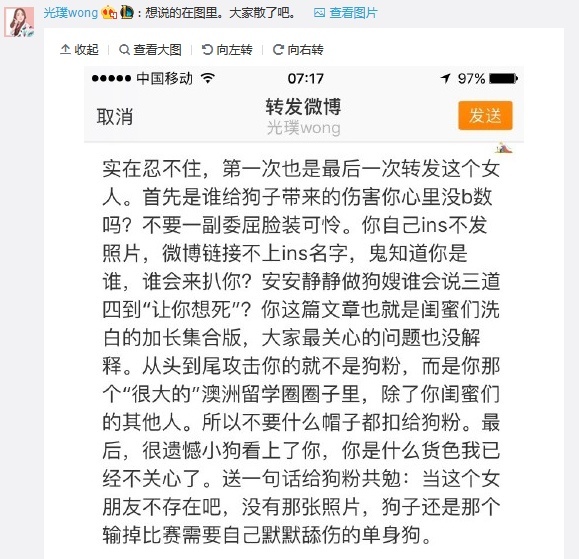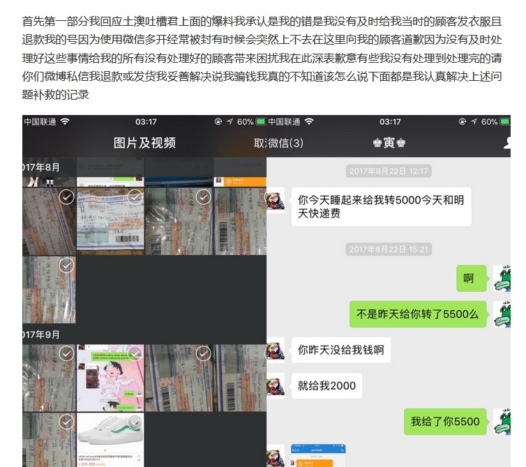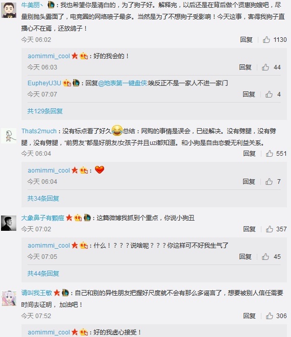 在上周末,RNG战队《英雄联盟》分部职业选手Uzi与女友在迪士尼游玩的照片被网友曝光,不久后他的女朋友也在INS上公布了二人的照片,这段恋情也算是正式公开了。 在RNG输掉比赛当日,这位小姐姐还发了一条微博安慰小狗,可以说是相当暖心。 不过在这个女友曝光后不久,在微博和INS上就出现了大量关于她的负面信息,各种认识她或者认识她身边人的小伙伴都纷纷跑出来爆料...有质疑她整容的: 有曝光她做微商卖假货、骗钱的: 还有吐槽她私生活比较混乱的: 面对着这些网上的言论,今天清晨Uzi女友奥咪咪本尊出面发表了一篇长文澄清。 由于这篇澄清文完全没有标点符号,看上去非常费劲,所以小编截取了部分重点内容,全文大致内容如下: 首先回应的是“卖假货”传闻: 关于卖假货这一点,奥咪咪表示:“我承认是我的错是我没有及时给我当时的顾客发衣服且退款。我的号因为使用微信多开经常被封,有时候会突然上不去,在这里向我的顾客道歉,因为没有及时处理好这些事情,给我的所有没有处理好的顾客带来困扰,我在此深表歉意。有些我没有处理到处理完的,请你们微博私信我退款或发货,我妥善解决。” 第二是回应ING里的暧昧合照,她表示和在她合照中最频繁出现的那位“男士”其实是个妹子,只不过是个T: 她表示这个T妹子是她多年的好友,小狗知道这个人,并且他们还经常一起打麻将一起玩。随后,奥咪咪还发出了不与不少好友的聊天对话截图: 第三是回应被质疑的“同居前男友”: 奥咪咪表示该男生是她玩的比较好的朋友之一,称他由于在澳洲读书找不到房子便与自己合租,房租也是AA的。 同时还发出了平时与小狗私下交流的截图: 甚至还晒出了为小狗买东西时的聊天记录截图: 最后还晒出了不少好友为她打抱不平的聊天记录: 总体来说,这位小姐姐在长文中澄清的重点大致如下: 我的确卖过假货,也拿了钱几个月没发货,但是现在正在处理善后; 所谓的暧昧照都是朋友和朋友的男朋友,其中还有T; 异性好友没有房子住,我把房子借给他住; 以上这些小狗都知道,小狗和我的朋友们都认识并且经常一起玩。 看了这位小姐姐的长文后,有不少粉丝选择相信她,并祝福她和Uzi: 但也有部分人认为这篇所谓的澄清写的避重就轻,而且聊天记录也都是近期的,似乎有即兴伪造来洗白的嫌疑: 目前有女朋友的职业选手不在少数,但没有任何一个人的女朋友能够带来这么大的一波节奏,这波新鲜的瓜相信也让不少看官们吃得直打饱嗝。究竟事情的真相如何我们目前无法得知,时至今日小狗也从未针对此事作出回应,最后只能希望小狗不被这些琐事困扰,专心训练在明年打出更好的成绩! |
