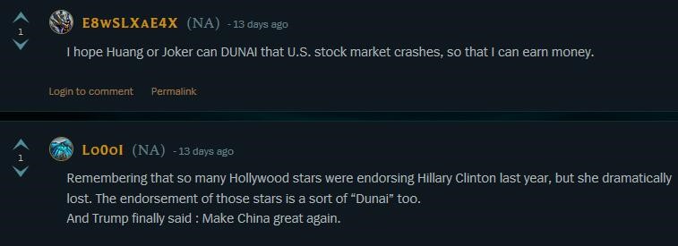 终于,黄旭东的毒奶已经越过了国境线,国外玩家也开始了解到黄大仙的法力,在今年《英雄联盟》S7期间,有中国玩家把毒奶色的事迹介绍给了外国朋友,引来大家的关注和议论,一些不懂汉语的老外也开始纷纷玩起来DUNAI这个梗。 帖子中称,在中国的电竞界,有这么一号人物:Xudong Huang,他的言论堪称“Dunai”,他祝福过的战队或是选手没有得到好下场的,然后从2014年的飞龙骑脸怎么输,讲到到2015年的韩国队0比5负于法国队,再到今年9月,他预言的“skt做为电竞豪门,lol三连冠霸主,王者之师,很可能要翻盘”,结果决赛SKT被3:0击败,如此Faker也不能逃过Dunai。 老外们听了很快就了解了其中含义,甚至还举出了自己国家的Dunai教主,比如解说Artosis,以至于有些国外战队的粉丝求大仙以后不要给自己偶像施法,也有的想学些老仙的Dunai之力,甚至已经有的开始学习Dunai开始预言接下来的LOL全明星赛。 上面这位求大仙Dunai一下美国股市,下面这位觉得Dunai堪比之前大选中支持希拉里的美国明星们 除了玩家之间的议论,还有不少外媒也开始报道Dunai的事件,看来这一股来自东方的神秘力量势必要席卷全球了。 |