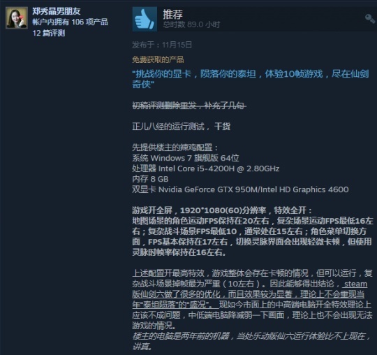 昨日,《仙剑奇侠传6》正式在steam上发售,售价为60元,首周优惠为54元。《仙剑奇侠传6》曾因糟糕的优化和大量的BUG遭到玩家的吐槽,而本次在登陆steam后,玩家们似乎也并不买账。 《仙剑奇侠传6》刚发售时,一位玩家曾使用当时最顶级的显卡四路泰坦来测试此游戏,发现在进行游戏时,显卡温度可达到85度左右,因此这款游戏也被笑称为“泰坦损落6”。在steam版上,《仙剑奇侠传6》的优化有了大幅度提升,配置较低的电脑也能运行的起来,这点让大部分玩家表示满意。 也有较多玩家表示,《仙剑奇侠传6》操作渣、BUG多、战斗系统体验极差的问题依旧存在,steam版本在这些方面基本没有做相应的优化。UI设计上也比较“反人类”,导航项目繁多、装备系统复杂、属性布局不直观,导致玩家的游戏体验极差。 截止发稿,《仙剑奇侠传6》steam版的好评率为48%,对比此前发售的仙剑4和5两部好评率高于80%的作品,《仙剑奇侠传6》的销量和口碑都明显低于前者。 虽然这部最新的国产仙侠游戏未能让玩家们满意,但仙剑粉们依旧对后续作品保持较高的期待,也希望《仙剑奇侠传7》能带给玩家们全新的游戏体验。 |