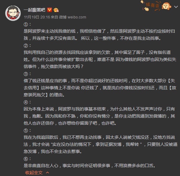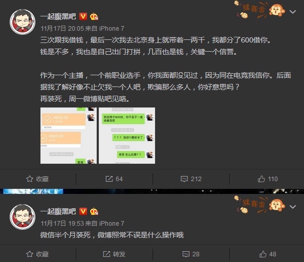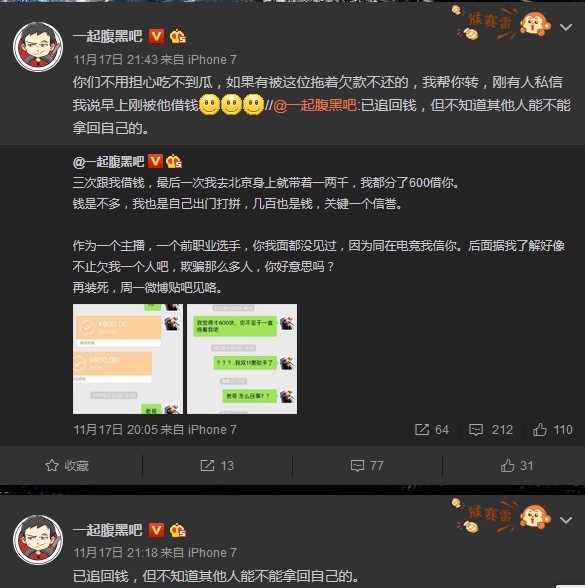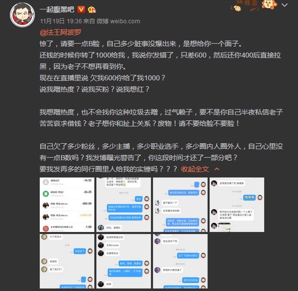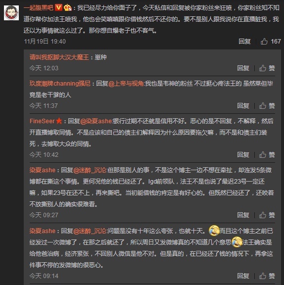 近日,“前LOL职业选手”借钱不还一事在网上炒得沸沸扬扬。起因是前几日有微博大V用户放出爆料,称某前职业选手欠钱不还,并一再发出微博催债。 随后这位选手似乎归还了他的欠款,不过该大V用户则发微博称“如果有被这位拖着欠款不还的,我帮你转”。 昨晚7点36分,这位博主曝光了欠钱的前职业选手身份——前LGD上单选手Funny,并且在微博中曝光了他与不少曾借钱给法王的圈内人士的聊天截记录。 不过在这条微博下方的评论中,大部分LGD或法王的粉丝前来为法王辩护,还有不少路人也认为虽然法王不回复是他的不对,但在已经收到欠款的情况下还揪着不放真的很难看: 最后这位大V似乎无法忍受法王粉丝的指责,又发了一条微博说明了事情的来龙去脉,并且把从借钱之前到现在的所有流程都列了出来: 其实这件事情上只能说双方都有错,支持这位大V的小伙伴认为,法王在别人信任你并借钱给你的情况下,到了约定还款日期不归还并失联的确有赖账的嫌疑;而支持法王的小伙伴则认为,这位大V在明知道法王家庭条件困难的情况下,因为一笔金额并不多的款项不惜发微博追债也有点落井下石的意思。不知对于法王这次的债务纠纷事件,各位小伙伴怎么看? |