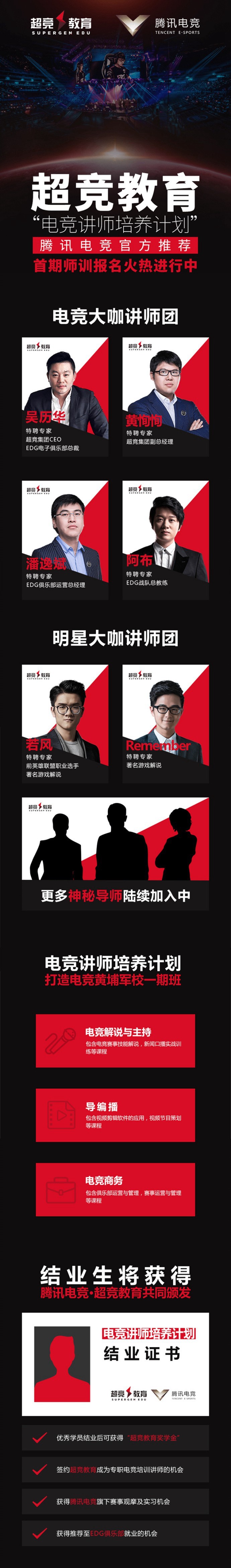 在电子竞技被教育产业所接纳后,越来越多的学校开始了专业的电竞教育。而电竞领域中的EDG战队最近也开始了自己的行动。近日EDG官微发博称“超竞教育”开启首期“电竞讲师培养计划”。 据悉,“电竞讲师培养计划”将会邀请到EDG总裁吴历华、EDG战队总教练阿布以及若风等知名业内人士担任讲师。学员将会向“电竞解说与主持”、“导播篇”以及“电竞商务”等三个不同方向发展。结业生还将会获得超竞教育与腾讯电竞共同颁发的结业证书,并有机会加入到腾讯电竞以及EDG俱乐部当中。 据了解,超竞教育是一家专业从事电子竞技教育培训的结构,与EDG俱乐部同属超竞集团旗下。2017年6月超竞教育与腾讯电竞签订了电竞人才培养战略合作协议,将会在未来五年联手腾讯电竞培养相关人才,填补电竞行业专业人才缺口。 “电竞讲师培养计划”将包含电竞心理学、互联网安全法、英语、电竞赛事相关方面的等十二个学习课程,总课时为300课时,学费为13800一期。 |