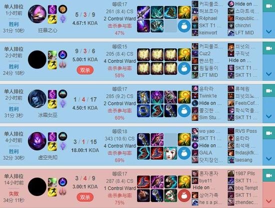 从S7失利的阴霾中走出来之后,Faker开始了疯狂的rank模式,在短短半个月的时间里,从钻一打到了韩服第四,与排在第一位的Deft相差不到100分,按照李哥目前的竞技状态,问鼎韩服只是时间问题! 作为一个S2便入坑的老玩家,倦客是看着李哥一步步走向神坛的,当然也亲眼目睹了他跌落低谷。不过,看到李哥现在的状态,倦客禁不止感慨道:李哥还是那个李哥,我LPL难道又要凉了吗? 上分如喝水! 至今仍无法忘却Faker泪撒鸟巢的那一幕,总害怕一代王者就此没落,回到韩国之后,也仅仅只开了一局排位便销声匿迹,更是平白增添了这份忧虑! 不过,在韩服客户端更新到S8季前赛的版本之后,李哥又重新回到大众的视野中,开启了疯狂的rank模式。 不得不说,认真起来的李相赫还是很可怕的,简单熟悉了一下新版本的改动,李哥的排名便开始稳定的上升。据倦客统计,自11月12日至11月27日,十五天时间内李哥涨了1000多分,要知道这可是韩服高端局,号称整个LOL玩家水准最高的赛区! 经常看Faker直播的玩家应该都清楚,李哥打排位的时候向来很随意,因此用的英雄都比较杂。截止到目前,共使用了40个不同的英雄,涉及到各个位置,英雄海深不见底! 其中,黄鸡使用的次数最多,共计22场,胜率高达77%,说句玩笑话,李哥似乎在用这个英雄向全世界的玩家们宣布:你们的皇帝回来了!不过,玩笑归玩笑,有一点还是需要注意的,黄鸡这个英雄在韩服很火,很多职业玩家都在偷偷的练习,不出意外的话,在S8常规赛中,应该可以看到这个英雄的登场。 李哥还特意玩了几局新英雄佐伊,老实说,新英雄的难度系数确实偏高,输出不稳定,李哥也是在坑了几把队友之后才找到技巧,目前战绩9胜6负,胜率60%。 |