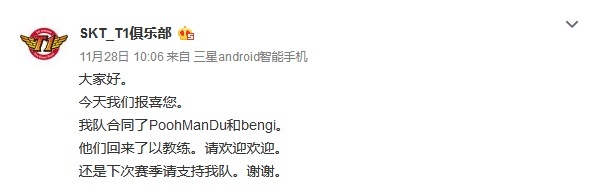 昨日,SKT战队官宣称与功勋老将PoohManDu、Bengi签约,在S8赛季他们将以教练的身份回归SKT。 说起李正贤和裴性雄这两个名字可能大部分人都不熟悉,但是说起SKT-PoohManDu和SKT-Bengi这两个ID,想必关注LOL比赛的玩家都不会陌生。前者身为SKT在S3赛季的冠军辅助,SKT-T1婕拉冠军皮肤的拥有者;而后者则随队斩获了S3、S5、S6三个赛季的冠军奖杯。 由于在S3赛季后因身体原因暂时离开,在随后复出的状态也不好,所以可能有不少新玩家对PoohManDu不太熟悉。但当年由PoohManDu和piglet组成的SKT下路拥有绝对的统治力,而在2014年底离开SKT后,与Mafa一同前往中国的IG战队担任教练。如今PoohManDu选择以教练的身份回归SKT,相信这也是最适合他的归宿。 相比起PoohManDu,Bengi这个ID则被更多人所熟知。这位安静沉稳的打野可谓是Faker在中路掌控雷电时最大的仰仗。他在比赛中以帮助线上崛起为主,而非注重个人发力,不少韩国战队的教练认为Bengi才是SKT在S5和S6时期势不可挡的“关键先生”,他能够在整个地图上给对方带来巨大的压力,让对手在对线期时刻心惊胆战。 毫不夸张的说,没有任何人能比Bengi更熟悉SKT的野区,虽然Bengi没有执教的经验,但相信在升职为监督的Kkoma的教导下,他很快能够成为独当一面的教练。 耐人寻味的是,在此前宣布的续约名单中,打野Peanut和上单Huni已经确认将离开SKT,目前SKT上单位除了替补选手Untara之外没有其他人选,而此前被誉为“最强上单”的Marin在宣布离开AFS后便没有了消息。目前网上有传言称Marin已经与SKT签约,将在S8复出。 但该消息的真实性还无法确认,在SKT官宣之前我们也无法得知真相。但可以确定的是,如果Marin真的回到了SKT,那么S8的SKT将会再次变成一支堪称无敌的宇宙战舰,让我们一起期待吧! |