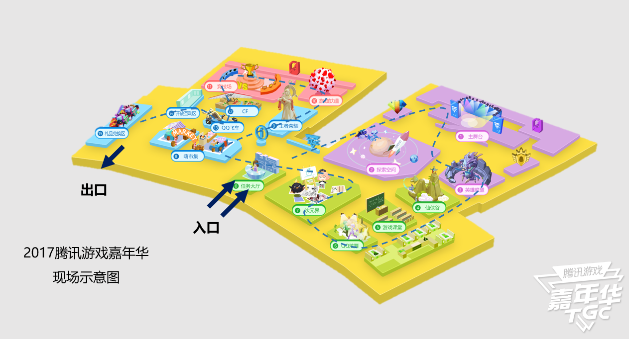 属于全国游戏玩家的年度狂欢盛宴——2017腾讯游戏嘉年华(以下简称:TGC2017)即将于12月1日-3日在成都世纪城新会展中心拉开帷幕。腾讯游戏将本次展会精心打造为“首款线下大型游戏”,真正将属于游戏的多重魅力带到玩家身边。 与往届不同的是,今年展区规模全面扩大,将在会展中心的4号、5号展区开放,官方也于近日正式公布了展台平面图。 TGC2017现场示意图 去年TGC为玩家们带来了五大版块,而今年的TGC则进行了质与量的双重提升。 除了较去年更大的展区,还准备了探索空间、竞技场、次元界、仙侠谷、嗨市集、游戏课堂、游戏的力量等多个主题区,腾讯游戏旗下五款超人气游戏《王者荣耀》、《英雄联盟》、《穿越火线》、《QQ飞车》、《QQ炫舞》分别在现场为玩家和粉丝们打造了IP专属空间,让每个到场的人一次性多维度地体验喜爱的游戏IP,包括相应的专业赛事表演、丰富的周边和礼品、超人气主播现场直播、真人NPC现场互动等,除此之外,与同好相遇也是来到TGC2017现场才会有的难忘收获。 TGC2017《王者荣耀》IP专属空间3D模拟图 TGC2017《穿越火线》IP专属空间“荒岛特训竞技场”3D模拟图 TGC十岁了,这一次,玩很大! 游戏世界,一般来讲是属于玩家群体的虚拟成长和挑战空间,从最初的红白机到PC游戏、手游、VR游戏,一代一代的游戏玩家享受着科技进步带来的更丰富的游戏乐趣。而在TGC十周年之际,组委会特别将本次展会以“线下游戏”的概念进行设置,玩家们前往TGC现场,将会以游戏主角的身份进入这款线下“游戏”中来,以穿越游戏世界的沉浸式体验,逐步挑战新手村、副本以及全场多张游戏地图,上百位Coser和NPC还会与玩家趣味互动,触发惊喜支线任务,达成更多游戏成就。 不仅游戏内容丰富刺激,通关奖励也有别于常规游戏——如果玩家完成八十个任务点的考验,就有机会获得全场终极通关大奖“vivo殿堂玩家大礼包”(一部王者荣耀定制手机以及一万元现金)。 此外,为了回馈广大玩家十年来的热情支持,TGC组委会还准备了iPhone X、《英雄联盟》定制皮肤、《狐妖小红娘》华县皮影、《圣斗士星矢》精美手办、万元Q币等丰厚礼品,让每一个玩家在畅玩线下游戏的同时,都有可能拿到奖品! 这一次,真的玩很大! (更多详情可查看官网信息) TGC2017主题:这一次,玩很大 首款大型线下游戏全曝光,七大地图任性玩! 这款大型线下游戏共拥有七大地图,每张地图会为玩家带来风格各异的游戏体验,玩家们初入“游戏世界”后,首先便会进入任务大厅领取自己的游戏任务,并据此逐步深入七大地图进行探索。 主舞台 主舞台是这款“线下游戏”里最重要的地图,这里包罗了整个TGC2017的重磅资讯和精华内容。 TGC2017主舞台3D模拟图 据悉,12月1日开幕当天上午就会有一款重磅新品发布。此外还有《圣斗士星矢》手游将携手松泽由美&戴荃重燃经典,并发布相关游戏信息,带领大家再一次燃烧小宇宙;“与你彤行”国民师姐关晓彤也将亮相主舞台首秀《剑灵》主题曲;筷子兄弟将携手千面小师妹为《全民飞机大战》4周年庆生;而知名艺人汪东城会出席Cosplay大赛并担任评审。 TGC2017出席明星 同时玩家们在该区域还可以观赏精彩的赛事表演,如王者荣耀职业选手表演赛、英雄联盟职业选手表演赛、QQ飞车全明星表演赛、极品飞车ONLINE 5城巡回赛等,三天时间,精彩电竞对抗轮番上演。其中由腾讯游戏竞技平台(简称:TGA)邀请Miss 、若风、55开、小苍等十大主播进行的全明星表演赛,将会助力TGA神秘代言人的发布。 探索空间 探索空间,则是玩家们即将在这款“大型线下游戏”中到访的另一张炫酷风地图。这里云集了VR、动作捕捉等各类黑科技游戏玩法:玩家可以在虚拟驾驶舱内用方向盘操作《极品飞车OL》,体验最真实的竞速乐趣;也可以身穿《拓星者》电影里的机甲,在虚拟游戏场景中进行射击体验;还能为《冒险岛2》咩咩岛的岛主张艺兴搭建心爱的咩咩羊;此外,现场还有近50款新游产品等待玩家去体验。 TGC2017探索空间3D模拟图 TGC2017《极品飞车OL》虚拟驾驶舱 竞技场 竞技场——TGC2017专为线下玩家打造的PK决斗区域,这里提供了《王者荣耀》、《英雄联盟》、《穿越火线》三款游戏的面对面切磋机会。玩家可以在现场报名水友赛,也可与电竞大神组队竞技,当一次电竞选手,知名解说还会为你的风骚操作进行实时讲解,让你真正感受关于电子竞技的荣耀时刻。 TGC2017竞技场3D模拟图 仙侠谷 仙侠谷,则是一张充满古风侠情的游戏地图。在这里,玩家们将变身少侠、侠女进入唯美的《自由幻想》世界;在《剑侠情缘手游》擂台玩转“比武招亲”及“门派挑战”;在《天龙八部》的聚贤客栈里,品刀剑诗酒、快意江湖;在《剑网3手游》的三生树下祈愿,寻找永不分离的情缘。 TGC2017仙侠谷3D模拟图 次元界 次元界,是一张汇集了动漫、文学、电影、Cosplay等诸多跨次元元素的丰富地图。玩家们可在这里见到腾讯多款游戏的原画和手办、玩偶、Coser红人、《圣斗士星矢》黄金圣衣1:1模型。同时,展区还将有3米高的巨型弹幕墙,玩家可亲手获取实体弹幕墙上《狐妖小红娘》经典场景指定弹幕;《纪念碑谷2》带你进入扭转现实的世界,探索神圣几何的秘密;《初音未来:梦幻歌姬》精彩宅舞表演等待你的应援。除此之外,适合休闲玩家的各种趣味玩法也应有尽有:穿上人偶套装与萌萌哒的人偶