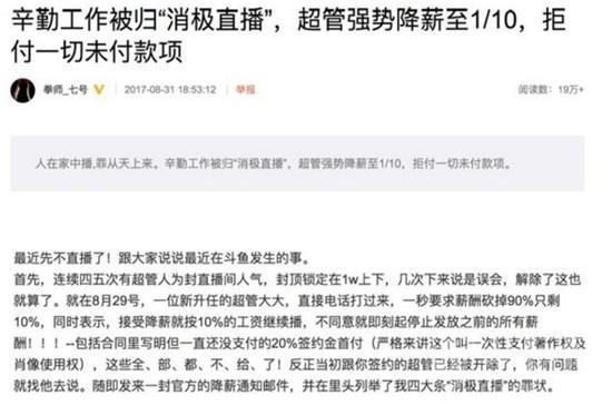 下半年斗鱼负主播出走不断,知名抗韩大主播拳师七号以及国服第一狮子狗辛巴等均因不满平台陆续跳槽,传言绝地求生大主播韦神也要离开,而户外主播远洋君同样爆出了对斗鱼的不满。 远洋君 12月4日,斗鱼土豪兼大主播远洋君来到YY霹雳爷们儿的直播间黑屏连麦,聊天过程中,远洋君哀怨说到“斗鱼官方让配合的都配合了,这节那节,让我刷给自己200万眼睛都不眨,抽奖从来没停,但我也想做斗鱼的一条狗,但斗鱼连条狗都不让我做”。随后大梁问远洋续约谈得如何了,远洋表示怕说错话,回头和大梁私下聊。 远洋君、霹雳爷们大梁 从对话可以看出远洋君不被斗鱼看重,颇有不满。刚刚从斗鱼离开加入YY的霹雳爷们儿,也有水友爆料到是因为不被斗鱼重视而转投YY。 大梁在这次连麦也说到很多主播都在暗中观察他们来YY后的表现,他表示YY对他很好,也安慰远洋君和他一起加油!可见两位昔日同事对老东家深有感触。不过大梁的这番话引起直播间水友吐槽“这么快就把官方大腿抱上了”! 小编统计到,除了以上两位,今年斗鱼内部问题还导致几位大主播跳槽离开! 先是抗韩知名大主播拳师七号薪资被斗鱼超管强势降至1/10同时人气被打压,因此跳槽虎牙,同时爆出:斗鱼斗鱼一直想逼迫七号做某些自己不想做的事情,也因此他表示自己不想成为附庸品。近日LOL国服第一狮子狗辛巴也是因“平台限制”痛苦不堪,离开斗鱼! 而斗鱼知名户外主播狗哥也曾爆出对斗鱼不满,赌气出走一段时间。 小编认为,接二连三的主播爆料可以看出斗鱼内部确实存在问题,作为一个喜爱看直播的观众,优质的内容才可以让观众留足、关注、刷礼物,如果压榨主播只求礼物效益,而不重视主播的内容价值,确实是得不偿失!不知道广大吃瓜群众怎么看这件事呢? |