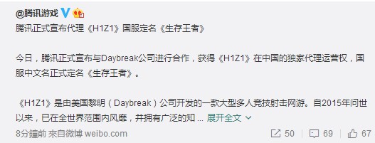 腾讯正式宣布代理H1Z1 国服定名《生存王者》