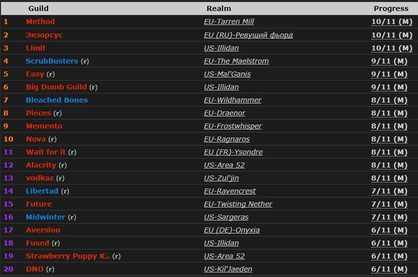 12月8日战报: 12月8日下午15:08分,Limit世界第三、美服首杀阿格拉玛,进度10/11M。与欧服两大天团会师寂灭者阿古斯!! 史诗燃烧王座世界首杀: 加洛西灭世者:Big Dumb Guild(2017.12.5 23:12) 萨格拉斯的恶犬:Limit(2017.12.5 23:23) 安托兰统帅议会:Limit(2017.12.5 23:38) 传送门守护者哈萨贝尔:Limit(2017.12.6 0:09) 生命的缚誓者艾欧娜尔:Limit(2017.12.6 0:55) 猎魂者伊墨纳尔:Limit(2017.12.6 2:43) 金加洛斯:Limit(2017.12.6 7:30) 瓦里玛萨斯:Limit(2017.12.6 9:59) 破坏魔女巫会:Limit(2017.12.6 11:38) 阿格拉玛:Method(2017.12.7 9:47) |