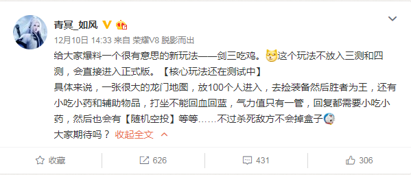 随着《绝地求生》的火爆,各种FPS游戏都开始争相上线“吃鸡玩法”,腾讯网易两大厂商更是在手游领域打的不可开交。就连许多RPG网游也拼命向吃鸡模式靠拢,继《九阴真经》新版本“雪域逃杀”上线后,近日一位知名游戏博主在微博爆料,《剑网3》也要上线吃鸡模式了。 从这位博主的微博中我们可以了解到,《剑网3》的吃鸡玩法是在一张很大的龙门地图里,放100个人进入,捡装备PVP,胜者为王。还有小吃小药和辅助物品,打坐不能回血回蓝,气力值只有一管,回复都需要小吃小药,也会有随机空投等等……不过杀死敌方不会掉盒子,看来再也不用担心自己“落地成盒”了。 值得一提的是,《剑网3》的新玩法还没有到公开的时间,据博主描述,是策划总监郭炜炜聊天时无意泄露出去的。 该博主转发的其他微博展示了他参与剑网3重置版玩家高峰论坛的照片,可见消息还是具有一定真实性的,目前剑网3官方还没有对“吃鸡玩法”的消息做出回应。 《剑网3》近年来什么火就做什么的策划方式,让游戏的热度一直非常高涨。这样看来把MMORPG中的战场PVP模式强改成吃鸡玩法也不是意料之外的事情,至于这个新玩法什么时候放出,只能耐心等待官方的正式公告了。 了解更多相关信息,请前往http://jx3.yzz.cn/ |