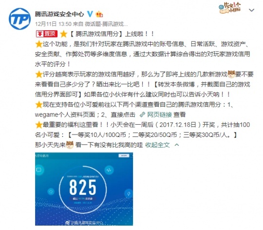 昨日,“腾讯游戏信用”功能悄然上线,腾讯游戏信用是腾讯游戏安全中心针对玩家在腾讯游戏中的多维度信息,通过大数据计算综合得出的对玩家游戏信用水平的评分,评分越高表示玩家的游戏信用越好。腾讯官方在公告中直言“为了即将上线的几款新游戏”,看来腾讯也是为《绝地求生》的国服操碎了心。 根据官方介绍,腾讯游戏信用分的衡量标准包括如下五个维度:账号信息、日常活跃、游戏资产、安全贡献、作弊处罚。 账号信息:游戏账号状态是否正常,账号信息和真实的个人信息是否一致。 日常活跃:玩游戏的时长、天数等,经常玩游戏可提升信用分。 游戏资产:在游戏中的装备、道具、金币等游戏资产,资产越多,信用分将会越高。 安全贡献:如果积极参与游戏举报,并且举报确认是有效的(即官方审核后确认举报的玩家确实存在作弊行为)将会增加信用分;但如果官方发现存在恶意举报行为,将会降低信用分。 作弊处罚:判断过去一段时间内是否在游戏中有消极游戏行为(逃跑、挂机、骂人等)或者作弊行为导致被封号、被禁言、被禁止参加排位赛或者其他处罚,被游戏处罚将会降低信用分。 简单的来说,实名认证、游戏活跃、有效举报等行为都能提升你的信用分,而恶意举报和消极游戏被处罚都会降低你的信用分。当然也有一条捷径可以提高信用分,那就是充钱,因为游戏中的装备、道具、金币等游戏资产越多,信用分就会越高。 目前看起来信用分数可能会对不良游戏行为造成强有效的打击,如果信用值成为了玩家段位以外另一个炫耀的指标,那么游戏环境想必是会向良性发展。游戏资产这一衡量指标也算合理,毕竟资产越多违规成本就越大,价值越高的号就越会担心违规可能带来的风险。小编比较担心的是可能会衍生出的刷分等灰色产业,或者通过充钱提高信用分从而达到提前解封外挂号等现象。 为了测试腾讯游戏信用分中充值所占的比重,小编登录了三个账号进行查询。 账号一:心悦一用户,英雄联盟双赛季大师、200多个皮肤,王者荣耀VIP7、王者段位,每天2~3小时游戏时间的账号,信用得分高达978分,超过99.7%的玩家。 账号二:从未玩过任何腾讯游戏,但使用腾讯的其他业务有大量充值的账号,信用得分高达932分,超过98.3%的玩家。 账号三:多年玩过大量腾讯游戏,但基本没有充值行为的账号。该账号英雄联盟铂金段位、王者荣耀钻石段位,每周10小时左右游戏时间,除了个别掉线情况外没有其他消极行为被处罚,信用得分为616分,超过81.9%的玩家。 如此看来,充值在腾讯游戏信用分中占得比重还是蛮大的。 但值得肯定的是,腾讯此次推出游戏信用分,主要是为了进一步规范游戏行为。不管是《H1Z1》还是《绝地求生》,阻碍游戏发展最大的毒瘤就是外挂,“神仙打架”屡禁不止。而腾讯已经在用实际行动证明自己有足够的实力和决心去解决外挂问题。 各位小伙伴,你们的信用分有高呢? |