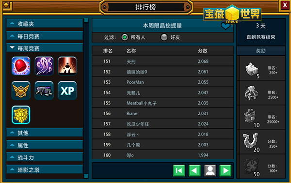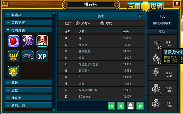 人生,就是一场比赛,排行榜,就是我们荣耀的见证。在《宝藏世界》中,各种各样的挑战和排行榜见证着你的大佬时刻,你的游戏印记,同时这些挑战还隐藏着许许多多的宝藏哦!打开K键,发现新世界的大门!快来看一看那些也许被你忽视过的排行榜吧! 【随机排行榜 周周有激情】 人生,也许就是一个挑战接着一个挑战,一个比赛接着一个比赛。也许,对你来说,早已对一层不变的挑战丧失了斗志和兴趣,但《宝藏世界》中的挑战和排行榜也许会改变你的看法。在《宝藏世界》中,竞赛栏目是每周随机刷新的哦,每周的竞赛项目都不同,想要赢得挑战,名列前茅,你所面对的挑战也完全不同。每周五晚上七点后至下周五晚上七点为一个周期,在此期间,所有玩家都可以针对本周竞赛项目展开角逐。同时,每周竞赛项目都不同,也许这周是经验排行,墓灵战力,下周就是摧毁方块总数、糖果野蛮人战力PK等等。总之,在《宝藏世界》中,每一周都会有全新的挑战等你前往,也有不同的宝藏等你发现哦! 【见证游戏印记 排行榜无处不在】 在《宝藏世界》中,排行榜意味着至高无上的荣耀,意味着万人仰望的目光,同时也意味着无数的宝藏哦!每周五晚上周榜揭晓的时刻,也是你收获无限宝藏和威名的时刻。同时,挑战越大,惊喜越多。在《宝藏世界》中,竞赛的栏目五花八门,你的一举一动都可能是比赛项目哦!放置方块、摧毁方块、击杀怪物、完成副本、钓鱼、送出爱心喇叭、开启宝箱、挖限晶矿、投掷皮纳塔等等,都可能成为你们本周竞赛的主题哦! 在《宝藏世界》中,在排行榜中名列前茅意味着无数的宝藏哦,暗影皮纳塔、混沌宝箱、附魔宝箱、职业宝石钥匙、皮纳塔、光明混沌宝箱、钻龙石等等奖励等你拿哦!快来加入《宝藏世界》,在各大竞赛中一展身手吧! 《宝藏世界》官方网站:http://bzsj.youxi.com/ 《宝藏世界》官方微博:http://weibo.com/trovegame 《宝藏世界》官方微信:trovegame 《宝藏世界》官方玩家Q群:534624763 游戏介绍: 首款角色扮演沙盒网游《宝藏世界》公测开启!这个集创造与冒险于一身的自由世界等你体验,全民创世纪时代现已开启!《宝藏世界》里有15种职业,210种主副职搭配,完整的宝石、勋章、附魔等个人战力养成体系,上千种翅膀坐骑,千奇百怪的奇葩宠物,还有零门槛多人建造玩法,独特的音轨建造玩法,错综复杂的迷宫地下城探索,安全无忧的自由交易体系,完善的公会好友体系,你可以自由实现自己的梦想!真正的万人同服,自由无羁的MMO沙盒网游,将带给你完全不同的游戏体验!全民创世纪等你加入,去征服你的星辰大海! 了解更多相关信息,请前往http://game.yzz.cn/html/info-5509.html |