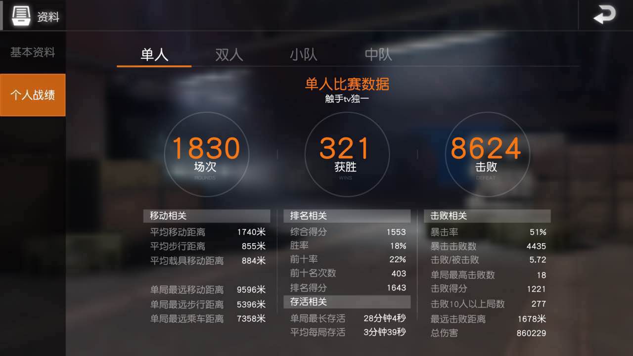 如今最火的手游《荒野行动》在更新了“五人开黑模式”后,正式宣布玩家下载量超过一亿人,日活跃用户五千万。虽然比起《王者荣耀》的四亿下载量还差很多,但这毕竟是一个测试还不到两个月的游戏啊,等到它像《王者荣耀》一样成熟时,也许玩家数就会远远超过了吧? 作为竞技性极强的生存类游戏,绝大多数玩家都想知道这五千万玩家中究竟谁最厉害,谁是当之无愧的吃鸡一哥。然而由于优化原因,游戏内部的排行榜是有重大缺陷的。无论是综合榜、胜场榜还是战斗评定榜,都不计算总场数,因此占据榜单前列的都是老玩家的新账号,那些不屑于搞小动作的顶级玩家,反而没有被收录其中。 然而聪明的玩家们还是通过各种渠道和截图,计算出了如今IOS系统的第一人,那就是触手直播的主播独一。 独一总共参与了1830场游戏,按照每局平均五分钟来计算,那就是玩了152个小时,就算一天玩4个小时,那也是玩了38天,也就是说这个游戏刚发布,独一就在玩,而且一直玩到了现在。1830场游戏中,独一共获得了8624个击杀,平均每局超过四个击杀。其他数据也都远超平均值,如此高的游玩时间和击杀数量,是所有榜单上的玩家远远不能比拟的,而独一也因此成为了手游吃鸡当之无愧的一哥,被十万在线粉丝们称为“手游韦神””、“手游吃鸡一哥”。 了解更多相关信息,请前往http://game.yzz.cn/html/info-6319.html |