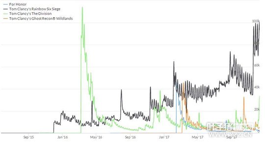 玩家是喜新厌旧的,所有游戏厂商都希望旗下产品能够长线运营、热度不断走高,同时也规避了新作开发的风险,但是强如《王者荣耀》、《守望先锋》都难以解决这个问题。在《绝地求生》不断蚕食其他Steam游戏玩家的同时,熬了2年的《彩虹六号 围攻》却逆势而上,取得了注册量和日活的双重突破。 前作《彩虹六号 爱国者》惨遭腰斩、首发期间隔三差五的服务器问题、与两部千万级的FPS大作前后脚发售,姥姥不疼舅舅不爱的《彩虹六号 围攻》在2015年12月首发期间表现可谓惨淡,Steam DAU在10000人左右。 这样的首发表现几乎已经判了《彩虹六号 围攻》的死刑,典型的扑街货。 令人出乎意料的是,这款游戏居然靠着一次次DLC的更新完善和顽强的运营实现了低开高走。2017年12月10日,该作的注册玩家超过2500万,同时在线人数突破10万,远远好于首发。 如同赛亚人般的《彩虹六号 围攻》一次次被唱衰,却又一次次从泥潭里爬起来越战越勇。当年那个笼罩在阴影下的小角色,2年后摇身一变俨然成了育碧的头牌之一。 从弃子到头牌,熬出头的硬核游戏 《彩虹六号 围攻》发售之初最大的质疑莫过于纯粹的多人模式如何实现战术射击的特性。育碧蒙特利尔把封闭的立体战场、详细的职业分工和小队交流浓缩到一场场攻防战中。射击、战术规划以及战术执行被严丝合缝地拼装起来,甚至战术意识的优先级要高于射击技术。