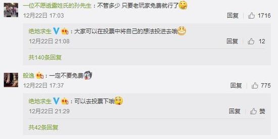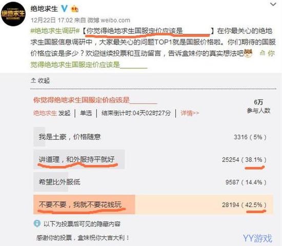 12月22日《绝地求生》腾讯官方微博,发起了定价调查,目前已经有6万玩家参与投票。 截止12.25下午,查看了投票结果,令人大吃一惊! 60%玩家愿意花钱 原以为中国玩家习惯于免费玩游戏,没想到在steam模式带领下,只有42.5%希望免费玩游戏。 38.1%的人愿意和外服持平。 相信最终结果会在这两个二选一。 增加开挂成本 远离外挂,从自己做起! 目前市面上的吃鸡游戏都面临开挂人数多,监管力度不够的问题。 假若腾讯的账号98块,相信很多挂逼会掂量下钱包。 当然开着一天198¥开挂的土豪也很多,能把这么有钱的账号举报,成就感十足呀! 目前,对于腾讯的安全监管还是很有信心。 再见吧小学生 《王者荣耀》老玩家都被小学生坑怕了,希望98块的门槛能隔绝小学生的脚步。 目前,腾讯也已经推出适合小学生级别玩的吃鸡游戏——《穿越火线》。 大家井水不犯河水,目前玩过吃鸡的都知道,《绝地求生》上手难度大。 假若被低龄段玩家进入,绝对没有最坑,只有更坑! 希望老玩家免费? 老玩家免费的可能性很小,目前花98块在steam上吃鸡的玩家。 大部分是中国游戏消费玩家,中等以上水平。 只要腾讯国服做的好,鹅厂根本不怕老玩家不过来玩。 |