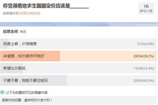 就在这几天,绝地求生国服微博发起了一波投票活动,是关于游戏定价的。 从目前的投票结果来看,主要分两个阵营。一个是“花钱可以,跟外服持平就好”,另一个则表明就要免费玩,而且人数不少。但从网友评论来看,大多数网友都是不支持免费的,主要原因就是两点: 一方面,如果免费,肯定有人弄一堆小号,封号?无所谓~这样的话修仙玩家越来越多,游戏就没个玩了。 另一方面,游戏免费,肯定抵不住小学生的入侵····很多评论表示不想跟小学生一起吃鸡···· 小编觉得,吃鸡还是收费的好,游戏成本上去了,玩的玩家就更加硬核了~ 你们想要国服是免费的还是付费的呢? |