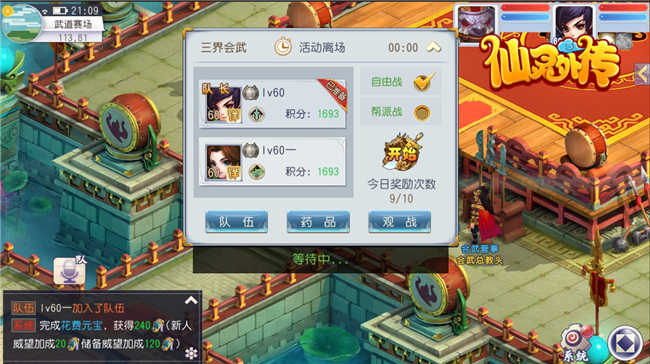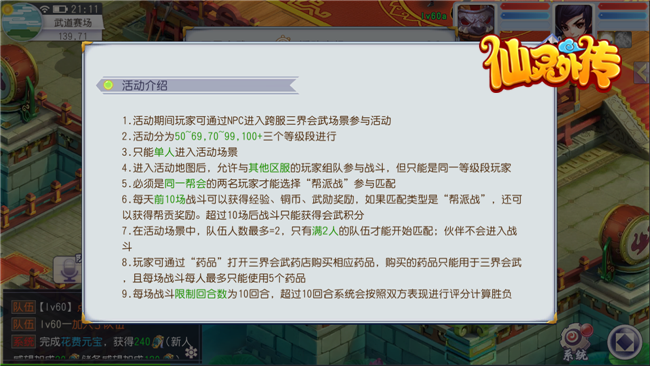 2017成为了过去式,新的一年已经开始,各位仙友有没有定下什么小目标呢?3D仙侠大作《仙灵外传》在新的一年里也不会停下脚步,将继续为大家努力推出更多经典有趣的玩法! 说到做到,灵儿这就给大家曝光今年第一个重磅消息!《仙灵外传》即将推出更加畅快淋漓的新PK玩法——三界会武! 三界会武在每周一至周五的15:00~16:40、22:00~23:40这两个时段内开赛。等级≥50级的玩家均可参加。 玩家只能单枪匹马进入三界会武的武道赛场景,进入之后方可找一位寻志同道合的小伙伴组队作战。三界会武分为“自由战”与“帮派战”,自由战不限区服可跨服组队战斗,“帮派战”则必须是同帮派的玩家组队后才能参与。 武道赛场内有专门售卖药品的商店,购买的药品只能用于三界会武,每场战斗最多可使用5个药品。活动除了常规经验、铜币奖励外,还有“会武积分”、“武道币”奖励,可用于购买三界会武商店的物品。 每场战斗的限制回合数为10回合,超过10回合系统会按照双方表现进行评分计算胜负,会武积分受连胜连败影响,连胜时获得的积分将增加,连败时扣除的积分将减少。 目前三界会武只在部分区服开展,我们将陆续在各个区服开放,敬请期待吧!强大的3D引擎全景再现西行美景,Q版唯美人设搭配经典回合制玩法,带你重游仙侠大唐!非同一般的西游世界,就等你来领略! 《仙灵外传》官网:http://xlwz.demigame.com 《仙灵外传》微信公众号:xianlingwzh 《仙灵外传》官方QQ群:410089606 |