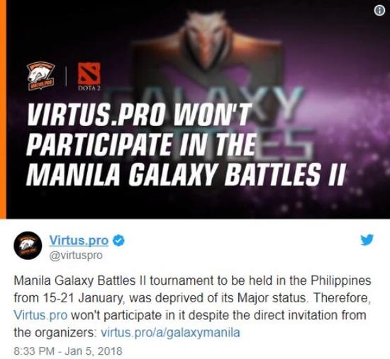 最近V社宣布,因触犯了选手隐私,取消了定于本月在菲律宾举行的DOTA2 Major赛事银河杯,TI8 1500积分也随之消失,奖金缩减到了50万美元,不过主办方仍然可以自行举办赛事。 消息一出,战斗民族VP宣布退赛,成为第一支退赛的战队。这恐怕会引起各大战队的退赛潮,毕竟TI8积分已经不再,而且奖金也大范围缩水。 根据火猫TV官方微博,菲律宾政府对银河杯被V社取消的事情做了回应,大意是毒品检测是菲律宾的法律,所有人都要遵守并接受检测,检测通过就会获得证件。电子竞技作为一个新兴项目虽然没有明确规定,但是也不能例外,菲律宾本地的选手都已经通过检测并拿到证,希望国外选手及公司都能遵守菲律宾政府的规定。 |