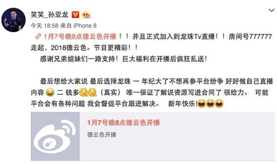 前不久,笑笑和西卡在直播间就透露德云色在2018年将和老东家斗鱼TV分道扬镳,虽然没有给出确切的去向,但随着笑笑关闭直播间,坊间关于笑笑的去向也成了热议的话题! 而在停播数日之后,笑笑正式在自己的个人微博表态:下一站,龙珠TV! 说起龙珠平台,其实在如今的几个大平台中不算是主流一线的平台,无论是资源还是背景都不能与斗鱼、熊猫以及虎牙相匹敌,那为什么笑笑会选择去龙珠呢? 根据笑笑自己的这份描述,其中一个很重要的原因就是[解说] 笑笑曾经说过,自己现在老了,不适合再继续油着做直播,所以官方解说嘉宾这个 条件对他是很有诱惑力的。 而签约了龙珠之后,未来额2018年,我们将可能有很多机会看到笑笑出现在大大小小的LPL或者LSPL的赛事解说舞台上,毕竟这是他来龙珠最大的条件! 另外就是德云色将在1月7日正式复播! |
