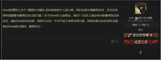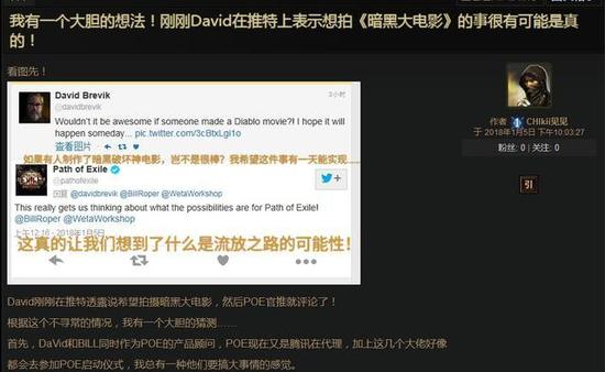 1月5日,暗黑之父David Brevik在Twitter发出的推文一石激起千层浪。他表示希望暗黑系列也能和魔兽一样推出自己的大电影,这个愿望迅速得到了暗黑2死忠粉、流放之路官方推特的点赞支持,这一互动也引发了网友的诸多猜测,暗黑之父的梦想究竟能否实现? 谁将成为魔兽大电影的接班人? 2016年6月8日,魔兽大电影抢先美国时间2天登录中国各大影院,吸引了一大票魔兽死忠粉疯狂涌入并给出豆瓣评分7.7的高分。如今,距离魔兽大电影席卷中国已经过去一年半的时间,其后《生化危机:终章》、《刺客信条》等游戏被相继搬上荧幕,但仍没有一部能够打破它创下的4.33亿美元的票房纪录。 等待了太久,让人不禁开始期待下一部能够创造如此票房奇迹的游戏IP。 就在1月5日,暗黑之父David在推特上透露希望暗黑系列也能和魔兽一样推出自己的大电影,之后迅速得到流放之路官方推特的点赞支持——如果细心可以发现,POE官推在回复的同时还@了另一位暗黑之父Bill Roper和。WeTaWorkShop。 (流放之路官推在David的推文下方评论表示支持) 这一互动引发了网友的诸多讨论,有玩家大胆猜测双方的互动正是为暗黑大电影的宣传造势,在电影院看到暗黑大电影已经指日可待,甚至开始为大电影建言献策。 (玩家纷纷建言献策) 玩家的高涨热情完全可以理解。在暗黑3的官方论坛凯恩之角中,玩家们早已按捺不住自己对暗黑续作的期待,包括对游戏续作暗黑4和电影的大胆想法。作为一个走过了21个年头的游戏,暗黑2已经成为许多玩家心中的RPG经典,期间没有任何的游戏能够挑战它的地位,为暗黑系列拍摄电影大概已经是众望所归的事情。 (玩家在凯恩之角发表对暗黑4的剧情猜测) (玩家在凯恩之角发表对暗黑电影的期待) 为何暗黑大佬们突发奇想拍摄《暗黑大电影》? 就在几天前,暗黑破坏神刚刚度过了它的二十一岁生日,官推才刚刚发文庆祝了这一特殊的日子,几天之后,David就发文表达了自己期待大电影的想法,让人很难不对这件事情的真正实现燃起希望。 (暗黑官推发文庆祝暗黑21周年) 而作为北方暴雪的创始人,David和Bill一直在以“有梦就追”为原则践行其各自的游戏理念。21年前,两人携手创造了RPG游戏的里程碑之作暗黑2,在认为暴雪无法继续为暗黑系列提供好的生长土壤之后毅然离职,但是身为暗黑的缔造者,David和Bill想必对自己亲手制作的游戏拥有深厚的情感,看到魔兽电影大放异彩,希望看到暗黑大电影面世也在情理之中。 而在David发出期待之后,流放之路(以下简称POE)官推也迅速点赞了暗黑大电影的想法。作为暗黑2的粉丝作品,它的制作人Chris可以说是暗黑2的忠实拥趸,甚至为了传承暗黑精神自己制作了这款新的游戏,而David和Bill在离职暴雪之后当起了POE的荣誉顾问,三人之间建立了深厚的友谊,POE与暗黑大电影之间到底会有怎样的联系,实在令人浮想联翩。 究竟暗黑大电影是否存在上线的可能性? 其实除了上面玩家的猜想和David单纯的愿望之外,暗黑大电影的上线还存在其他的蛛丝马迹。 在离职暴雪之后,David和Bill成了POE的产品顾问。而作为暗黑之父的David,除了希望看到暗黑系列能够持续散发强大的生命力,更是希望暗黑系列能够拥有更广泛的文化衍生,相信《暗黑大电影》就是最好的方式。 魔兽大电影虽然曾经席卷中国,但鲜为人知的是魔兽大电影背后的特效制作团队WETAWorkshop——也是POE官推在评论David时@的对象。 作为一家世界级的特效工作室,维塔的成绩一向令人放心,它曾五次获得奥斯卡最佳视觉效果奖,承担《指环王》、《阿凡达》、《X战警》、《地球停转之日》等影片的视觉特效制作,在《魔兽》里面也有不俗的表现,暗黑大电影如果能有它的加持,想必会更加令人期待。 (weta工作室曾为多部电影提供特效支持) 在POE国服3.0“夺神之权”的公测发布会上,GGG已经达成了和世界顶级特效公司WETA的合作,WETA将在每个赛季都为poe制作一款专属手办,还将为每个赛季中稀有度最高的暗金装备进行实体锻造,并且还在2017年的TGC上推出POE的face off秀。 (Weta工作室制作“奇塔弗”特效妆) (weta工作室道具作品) 在双方已经达成了一定的合作的基础上,将暗黑大电影交由WETA打造的可能性似乎更大。所以如果把此次POE官推对David的附和解读为POE团队愿意助力暗黑大电影的制作,可以说是为期待暗黑大电影的玩家打了一根强力定心针。 WETA工作室与暗黑大电影的渊源还不止于此,在发布会上,WETA创始人Richard和三位暗黑之父似乎相谈甚欢,对如何在暗黑游戏与特效制作之间建立更紧密的合作都发表了自己的看法,被媒体戏称暗黑四巨头的诞生,这一羁绊会否成为促成暗黑大电影的契机?现在联想起来,暗黑大电影也许在那时就已经有了初生的苗头。 (发布会现场3巨头合照:Richard(左)、Chris(中)、David(右)Bill因档期遗憾) 从商业角度出发,拍摄暗黑大电影的愿望有可能实现吗? 在暗黑21周年的节点,以及暗黑制作人的心愿、暗黑传承者POE的制作人Chris的强烈支持、魔兽大电影的幕后团队WETA的支撑下,我们再来探讨《暗黑大电影》能否上线的可能性。 现在,POE团队现在展现出了对“暗黑大电影”强烈的兴趣,我们可以这样设想,第一种可能,由暗黑之父和POE团队合力制作“暗黑大电影”;第二种可能,在David已经离开暴雪,而暴雪没有主观意愿的前提下,由POE团队牵头,借由腾讯团队这个第三方,以弥补