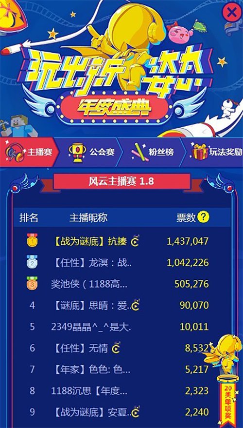 网易CC直播年度盛典经过一个多月的激烈角逐,1月8号终于来到了最后一个比赛日,两个最具分量奖项(年度风云主播、年度风云公会)的角逐也在今天落下了帷幕。抗揍二度获得年度风云主播,年度风云公会也由抗揍所在公会——谜底斩获。 小编凭借敏锐的直觉,打开CC直播就直奔抗揍的直播间去了!老王从一大早7点就开始直播了,期间不知道播出去了多少的资源、开了多少个抽奖!到晚上21:00左右,以及足足累积了140W张年度票!与第二名的龙溟拉开了一定的差距!虽说不是胜券在握,但也拿到了不小的优势! 到23时许,更是达到了160W票!旗下大奖在冲锋陷阵,作为【谜底】OW的冥想 想哥怎能不来擂鼓助威呢?23时约10分左右,冥想空降老王的直播间,废话不说!直接开干!直接就是666组2333!哎,等等666*2333等于多少?三六一十八,三六一十八...呃,还是掏出我祖传的计算器吧!等于1553778。好家伙,155万啊!老板一出手,就知有没有啊! 老王先是一通感谢,随后也对自己志在必得的心态直言不讳:时间还早,咱先照常直播,要是龙溟那边起飞,自己也会跟票!龙溟则是在自己的直播间隔空表示:无意争抢风云冠军,只想拿个亚军,重在参与! 这两天大家基本看戏也都看够了,在CC直播,想要打年度的主播怎么可能没点演技怎么混,小编会信?难不成又要玩偷塔的老套路? 随着时间一分一秒地过去,不知不觉间便来到了,最为激动人心的结算前倒数两分钟,两分钟、一分半、一分钟、40秒,眼见直播间仍旧是万里无云,横幅组成的七彩祥云并没有来! 老王悬着的心也是慢慢一点点地着地了,并提前发表起了自己的获奖感言!感谢来直播间出镜拉票的主播好友,感谢坚持守护的观众、感谢阔绰大方的老板们、感谢默默付出的工作人员...巴拉巴拉!直至获奖信息公布,小编期待的“意外”并没有发生,感谢老王!再一次证明了自己的人气和实力,并夺得了CC直播2017年年度风云主播大奖! 老王也是十分开心地炫耀起了自己此前拿到的两座小金人! 重点来了!在冥想老板开始刷屏前,老王刚刚开启了一个188的零食大礼包抽奖! 拿到大奖,老王兴致勃勃地抽起奖来!果不其然,共计1559672人次参与,其中有1553778由冥想老板送出,凭借1553778/1559672=99.62%的超高概率!冥想老板也不出意料地成功拿下了由老王送出的188零食大礼包!恭喜冥想! 老王得了便宜也不忘卖个乖:“三千繁华在吗?麻烦中奖的兄弟在我的包裹—中奖信息里填写下自己的姓名、电话、地址!一个零食礼包可以卖出155万,当初没送想哥辣片,果然是对的!” 最逗的是直播间的水友们!全都自发地刷起了“黑暗”!快把小编我笑岔气了!不过转念一想,155万卖一个188的零食大礼包!真的是细思恐极啊! 最后,年度风云决赛也在各位获奖主播传音聊天的大和谐画面里结束了! 再次恭喜【谜底】抗揍获得年度最佳风云主播冠军!同时也是老王本次年度盛典中唯一抱走三个奖项(还有最佳端游主播和最佳梦幻端游主播)的主播。同样也恭喜【任性】龙溟、【1188】奖池侠分获亚军、季军!恭喜! 2018!我们也将继续无畏前行! |