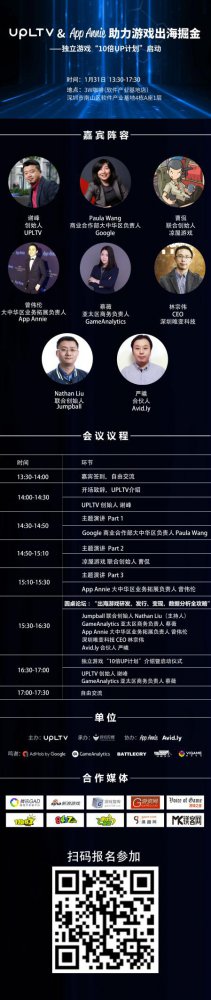 由UPLTV主办,游戏陀螺承办,App Annie和Avid.ly协办的“UPLTV & App Annie助力游戏出海掘金”分享会将于1月31日下午在深圳举行。活动旨在解疑答惑,分享资深游戏市场研究者的经验和观点。 此次分享会不仅有Google商业合作部大中华区负责人Paula Wang,App Annie大中华区业务拓展负责人曾伟伦,凉屋游戏联合创始人曹侃等业界大咖带来主题演讲,主办方UPLTV创始人谢峰将也从行业角度出发,就中国游戏出海前景和广告变现趋势进行分析,分享自己对海外游戏市场的理解和下一个机会点的观察。圆桌环节,GameAnalytics亚太区商务负责人蔡薇,App Annie大中华区业务拓展负责人曾伟伦,唯变科技CEO林宗伟,Jumpball联合创始人Nathan Liu和Avid.ly合伙人严曦,将从游戏研发、发行、数据分析等维度就中国游戏如何出海掘金进行讨论。 活动最后,UPLTV将联合欧洲知名游戏数据分析公司GameAnalytics(GA)宣布独立游戏“10倍UP计划”正式启动。 关于独立游戏“10倍UP计划” 作为移动游戏广告变现领域的领航者,UPLTV将联合欧洲知名游戏数据分析公司GameAnalytics(GA)共同发起独立游戏“10倍UP计划”。双方将出资百万美元扶持中国独立游戏开发者征战全球,帮助精品独立游戏进行广告变现、数据分析和买量推广,将现有收益提升十倍以上。除此以外,UPLTV和GA还将协助开发者针对性地解决独立游戏面临的痛点,如对接投资、发行、产品调优、渠道政策解读、本地化等环节,闭环式地帮助独立开发者提升全球市场竞争优势,提升整体收益。“10倍UP计划”将邀请游戏行业资深从业者作为评审并不定期公布入选开发者/产品。 独立游戏“10倍UP计划”的参与标准将在本次活动现场公布,有兴趣的开发者可扫描活动流程下方二维码报名参会: 如果你是独立游戏开发者,或者你的游戏想在全球市场获得成功,千万不要错过这次宝贵的交流机会! 关于UPLTV UPLTV总部位于上海,并在北京、西安设有分公司。UPLTV专注移动游戏广告变现领域,拥有一支资深研发团队,有多年产品开发、移动广告优化和变现经验。UPLTV运用先进的算法优化广告逻辑,从而显著提升游戏广告填充率和广告收益。此外,还基于谷歌TensorFlow框架,使用长短记忆网络(LSTM)来分析玩家行为,包括玩家如何在游戏中互动,何时开始或结束游戏,何时付费以及对广告的敏感程度。通过测试玩家反馈以及预测7日和14日留存率,便可优化广告展示时长以及频率,从而最大化提升玩家LTV,达到95%以上置信区间,并可实现“千人千面”的个性化广告方案,以达到用户留存率以及开发者收益的平衡。目前,UPLTV已与300多家国内外游戏开发者和发行商合作,每日广告展示超过3000万次,帮助这些合作伙伴从广告中获得了巨大收益,UPLTV也正在积极组建海外团队,计划在越南、韩国、新加坡、英国等地设立分公司,将业务范围拓展到全球。 关于GameAnalytics GameAnalytics(GA)成立于2011年, 总部位于丹麦,其团队分布在哥本哈根,伦敦和北京。为超过4万多位全球游戏开发者提供数据分析服务,包括Voodoo,FRVR, Histper Whale等知名开发者,并与Unity,Fabric(Twitter),Unreal等游戏引擎和开发平台建立了合作。目前其产品支持东西方服务器架构,为游戏开发者提供全球化数据分析服务。 |