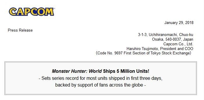 Capcom今日宣布,《怪物猎人:世界》在PS4和Xbox One平台全球出货量(实体出货+下载)已经达到500万。 《怪物猎人》系列作品截至2018年1月28日,全球累计销量突破4500万,《怪物猎人:世界》是系列最新作,目前已出货500万份,这也是该系列作品在发行之后的三天内实现的最高出货量。 另外,Capcom还宣布将在日后与好莱坞合作推出《怪物猎人》改编电影,敬请期待。 |