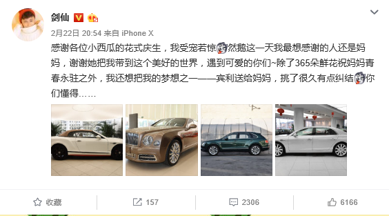 最近《王者荣耀》里最火的消息莫过于95后主播剑仙要给妈妈买一辆宾利做新年礼物的事:原来大年初七是剑仙的生日,粉丝们和妈妈都在直播间给他过生日,当天剑仙的礼物收到手软。粉丝们又是包下武汉、上海繁华街段的灯箱广告、“上海碗”循环播放,让剑仙这个生日过的非常有意义,剑仙表示非常感谢。 每一个人的生日,都可以说是妈妈的受难日,所以在这一天里,孝顺的剑仙除了一大早就给妈妈送去一束365朵的康乃馨以外,晚上当着400万粉丝的面,表示自己要送给妈妈一个特别大的礼物——一辆价值数百万的宾利车,羡煞粉丝。 剑仙是出了名的孝顺,此前已经有资讯曝光他每个月数十万的收入都交给妈妈保管。不过他又不是妈宝男的那种。妈妈早就在采访中提到过,剑仙从小就特别有想法,不会让父母当心,知道什么时候该做什么事,不用督促自己就会去努力。所以剑仙的爸爸妈妈很放心让儿子去做自己想做的事,而今他终于在自己喜欢的事情上做出了成绩。 在收到剑仙要送礼物的消息后,妈妈回复:“不要车子,只要你平安健康开心赶紧给我找个儿媳妇就好!生日快乐大宝贝。”妈妈的回复立刻引来粉丝们的围观,原来再贵重的礼物都不如有人照顾剑仙么?真是天下父母心,不过大西瓜会缺女朋友吗?立刻400万粉丝报名,男粉推荐自己的姐姐妹妹,游戏打得好又帅气多才的男生凤毛棱角了好吗? 不过单身了二十多年连女生手都没摸过,见面会上妹子在身边还会害羞的他,怕是不好找女朋友哦!连粉丝都说:“比起找女朋友来说,还是买宾利车比较简单一点。” |