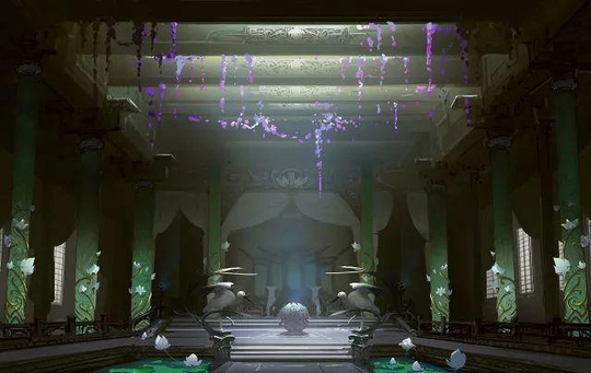 主殿概念图 3)移花五景之幻海花城: 长满了醉心花与其他植物的区域,在夜间醉心花发出胧月般的光芒,而其中蕴含的神经毒素又令人心醉神驰,仿佛产生幻觉。在宗主的管理和教导下,更高级的弟子们才能来到这里居住和生活,学习在不为所伤的情况下采集醉心花粉,予己所用。 要离开移花宫必须通过的“移花幻境”测验,也是在这个岛上通过醉心花的毒性而实现的。 驻守:幻海部 宗主-沈醉花(风雅入世,与萧曼声曾是夫妻) 4)移花五景之暮火焚霞: 移花弟子离去之后,会有人在此处为他点燃一盏长明之灯。 此处亦有暮火亭与焚霞亭两个观赏落日的最佳地点。 同时,如果有过于调皮或犯错的弟子,也会被明少卿罚来此地守夜。 驻守:横霞部 宗主-横霞子(明少卿好友,和蔼乐天,痴迷棋艺)