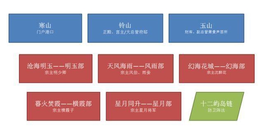 移花概念图 三 山 寒山-特色门户港口;铃山-正殿;笛山-玉矿、宝库;地势较高,建筑广阔。 1)寒山: 移花群岛之门户,是来去旅船首先停泊的港口之所在,也是初入移花时所见的震撼景色。有长廊、楼阁等,唐时李白曾机缘巧合,访移花群岛,更居住在寒山附近,离去时写下“寒山一带伤心碧”的名句。 风小雪-接引弟子 2)铃山: 东海移花的仓库和经济中心之所在,也是移花宫之正殿所在。 殿阁巍峨,飘渺如仙。此处也是移花地势的最高处。 驻守人:大总管苏霜华 3)笛山: 几乎是一整座巨大的玉矿!凭此一事,移花宫便可享万世之富贵。 而玉矿的最深处,则有移花宫的宝库,常人难以接近。 驻守人:副总管萧曼声(清冷出世,乃为移花乐圣。沈醉花前妻)