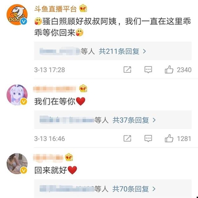 在复播之前,已经有大批水友在黑屏的直播间为骚白的母亲送出祝福,而微博上更有斗鱼官方表达对骚白停播的理解与关心,“白家军”的粉丝们都在等待他的归来,隔着屏幕就能感受到粉丝们对骚白深深的爱意。