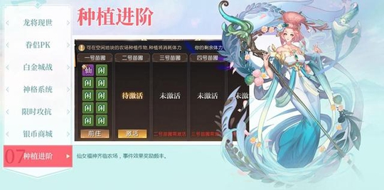 上仙送福 福神仙女齐聚 此次版本更新,还为玩家带来诸多福利:仙女与福神同降血盟农场,除了提升农场作物成熟度、健康度之外,还有仙女宝盒、福神宝盒福利,开启可获作物以及额外随机奖励。一年之计在于春,快来血盟农场邂逅仙女与福神!