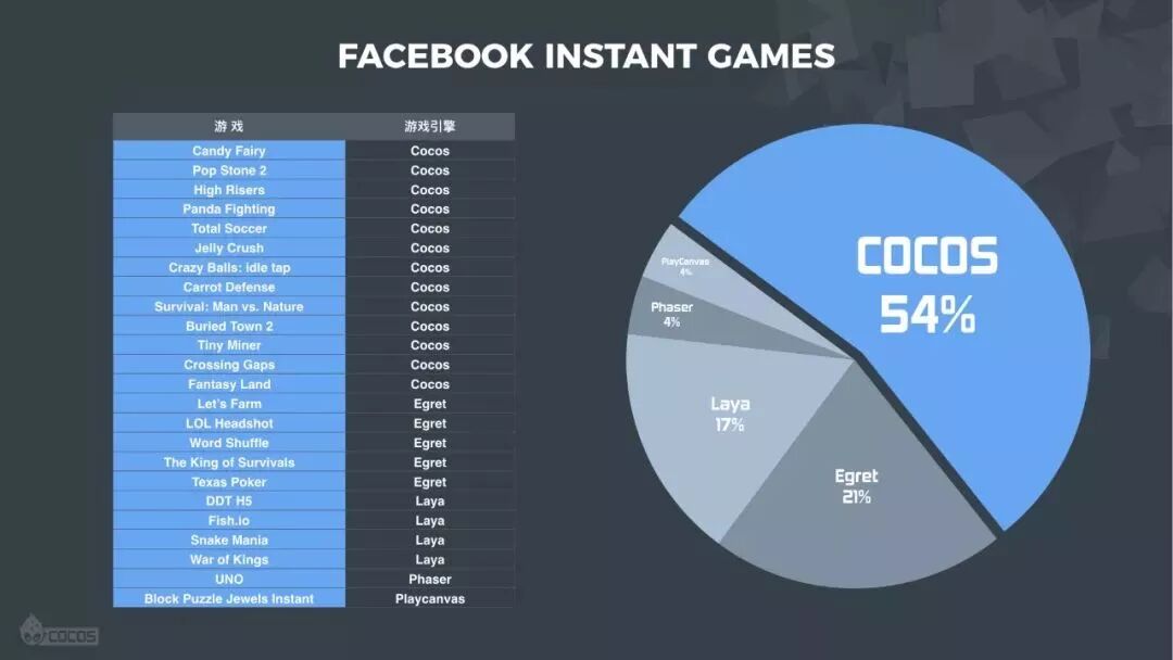 直到 2017 年 12 月 28 日微信发布小游戏,2018 年 3 月 15 日 Facebook 宣布开放 Instant Games 平台,都把 HTML5 小游戏推向了风口浪尖,大家才看到新的机会。之前有提前做 HTML5 技术布局的游戏公司,都从中获得了很大的增益。Cocos 引擎也在微信和 Facebook 首发小游戏里得到了新一轮的爆发,占据了绝对优势的市场份额。