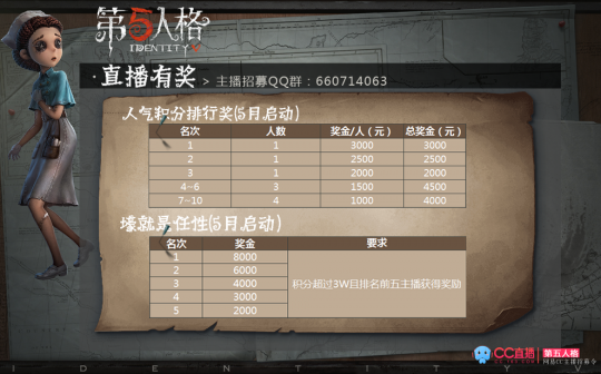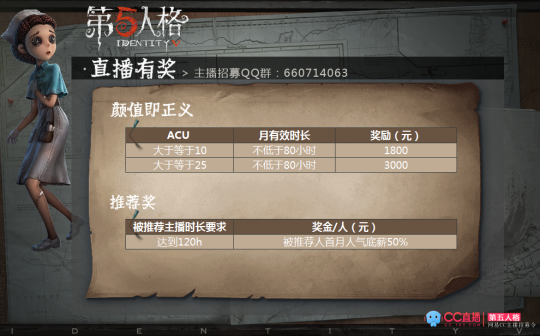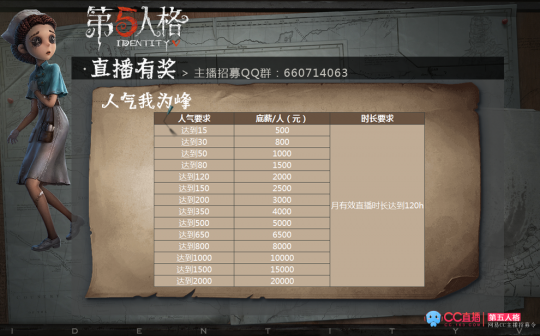 《第五人格》是网易首款非对称性对抗竞技手游。荒诞哥特画风,悬疑烧脑剧情,刺激的1V4“猫鼠追逃游戏”的对抗玩法,都将给玩家带来全新的游戏体验。网易CC直播《第五人格》主播招募活动现已开启,官方签约机会以及海量奖励等你哦! 有兴趣的主播可添加QQ群660714063,私聊群管理进行更多问题咨询以及主播报名。 人气我为峰 网易CC直播热烈欢迎各路人气主播大神降临网易CC直播,我们为各位主播准备了非常详细的任期奖励规则,能力越大,回报越丰厚! 高手+修仙,总有一款适合你 对于游戏高手来说,那可是需要靠实力来赚钱的,我们也为各位高手定做了游戏排行榜奖励! 对于每天不分白天黑夜就是疯狂播播播的“修仙党”来说,哪能满足于上面的那些小时长,因此我们为大神量身定做了时长奖励! 努力就是会有回报 对于那些夜猫子来说,白天都留着睡觉了,哪有时间播游戏?深夜才是我的主场好嘛?没关系,小C为各位通宵档主播准备了特殊福利哦! 那些一直每天坚持不断进行直播的小伙伴,当然也是会获得奖励! 人气主播额外有奖 我们为各位人气主播制作了人气积分榜单,只要月直播市场不低于120小时。积分榜前10的主播都会有额外奖励哦! 看了人气排行奖,当然也少不了礼物排行奖啦,各位进驻大展身手的时候到啦! 颜值即正义 这么紧张刺激的招募活动,怎么能少了我们可爱的小姐姐们呢?美女主播就是有优势的,爱美之心人皆有之,小C也爱小姐姐亚,因此我们特意为可爱的小姐姐们定做了专属招募奖励! 还有就是,推荐有奖哦! |
