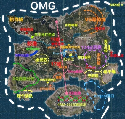 下面由网友创世纪一书总结出所有梗: 伟大航路 香蕉邀请赛时期OMG经典转移路线,开局落N港,找船,沿着机场岛南部海岸线,转西部海岸线,或从G城入海口入河,开船到R城上岸附近,或北上到Z城,在S城上岸。 捞月城 捞月狗LYG的固定跳点。 阿鲁黑洞 Sil,阿鲁卡在拼图楼对LG(好像是)一打三, 蛇港 最近的snake固定跳点 背包弹夹理论 55k透视物资外挂,把大仓内背包弹夹看成了平底锅 RNG 山脉 RNG打比赛,这座山在圈内必定上山顶 全民区 全民贺岁杯决赛,qm火眼金睛,一眼识别出麦田内的伏地魔,令人闻风丧胆 伊泽点 伊泽AK几瞄,弹无虚发灭掉在船上的VG,也可称为 VG黑洞。 17 城 从MG到17队的固定跳点 AK 点 P城附近为数不多的刷车点,是XQ的AK偷车点。马牛逼“老大,AK又来偷车了” 超级瞄准悖论点 帝师锤五五开反向开挂 护国神厕 其实名字来源于G-star单排赛,OMG的M4天命厕所,拿下中国战队第一鸡,位置在p港圣山之间一个厕所。 此处标记为4排决赛4am吃鸡时的厕所,aluka最终炸死了藏于厕所的最后独狼,成功吃鸡