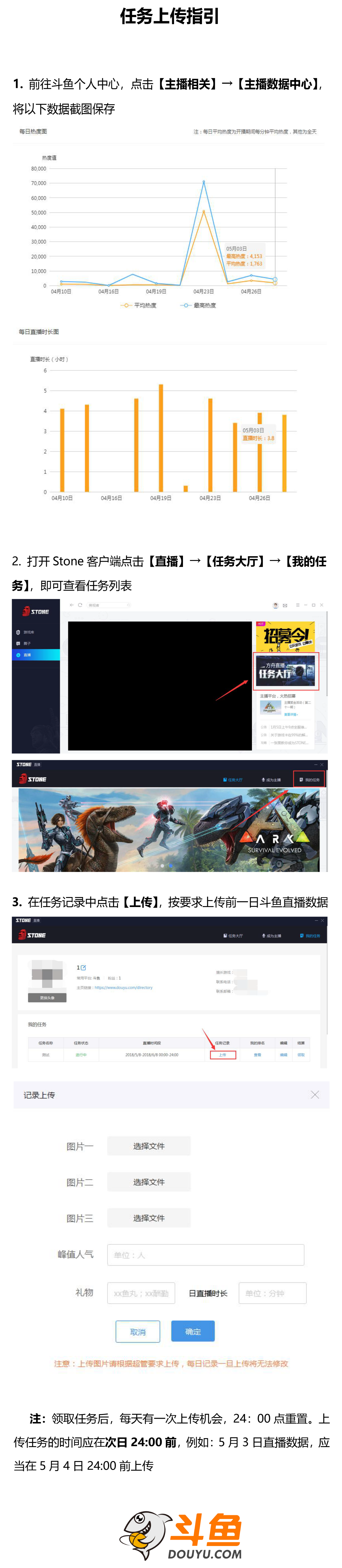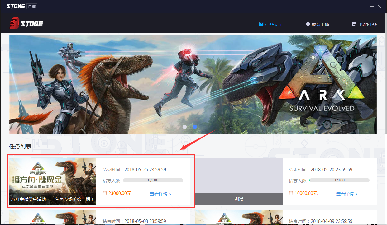 《方舟:生存进化》是一款由独立工作室Wildcard所制作的生存类沙盒动作角色扮演游戏。游戏以生存要素为主,并混合了独特的多人合作和竞争要素。游戏开始时玩家们将在某个神秘的小岛中醒来,而这里还有和玩家同样陷入混乱的一群人。而在游戏中,大家需要通过打猎、工艺、研究技术等多种方式来生存下去,此外玩家们还需要建立庇护所来保护自己,防止因为恶劣的天气、危险的野生动物或潜在的敌人丧命。 方舟主播赏金招募本周强势开启啦!本次活动由斗鱼联合蜗牛官方合作推出,只要直播内容为《方舟:生存进化》,不限服务器,Stone、Steam版本均可参与赢取官方扶持与现金奖励! 一.招募时间 招募时间:2018年5月15日 00:00 - 5月25日23:59(10天) 直播版块【方舟:生存进化】在斗鱼首页搜索方舟:生存进化即可 二.招募奖励 扶持奖励 凡参与活动主播,符合直播要求就能获得现金奖励,排名前10可获现金大奖。 表现优异的主播,将获得蜗牛官方推荐并有机会被邀请担任官方比赛解说。 现金奖励 方舟赏金 满足下列条件者,可获得100元现金奖励: 活动期内直播达到5天,每日直播《方舟:生存进化》游戏内容时长超过4小时。 每日平均热度达到100(以斗鱼官方后台数据为准)。 人气奖金 根据活动期间的有效直播时长,人气,播出质量综合计算出积分并排名,累计积分排名前10的主播可获得: 第1名 3,000(元)现金; 第2-3名各2,000(元)现金; 第4-10名各1,000(元)现金。 注:人气奖金与方舟赏金不能重复领取,积分排名前10的主播默认领取人气奖金。 三.参与方式 1.下载Stone游戏平台客户端 完成基础注册并登陆 3. 点击招募令,进入主播注册页面 4. 根据引导填写斗鱼主播信息并提交 5. 任务大厅领取直播任务 完成上述操作后加入斗鱼《方舟:生存进化》主播招募群,群号:642590575,进群务必修改自己的群名片:昵称+房间号。 四.活动流程 主播通过审核并领取任务后即可开播; 活动期间在斗鱼《方舟:生存进化》专区开启直播,每日直播结束后前往stone平台上传直播时长、人气等截图; 由斗鱼、蜗牛官方审核最终结果,并于活动结束后10个工作日内公布人气奖金获奖名单; 活动结束后12个工作日内,活动奖金将发放至主播预填写的银行账户内。 【数据上传示例】 (见下图) 五.注意事项 活动直播内容仅限《方舟:生存进化》其他直播内容不计时长; 主播需在stone平台填写预计直播时间段,将根据时段安排推荐位轮播。 直播期间禁止挂机录像转播其他平台,以及违反直播平台规定的行为; 严禁主播作弊行为(包括但不限于刷人气等),一经发现直接取消活动资格; 该活动仅限于斗鱼主播,发现多平台直播的主播将取消活动资格; 本活动最终解释权归斗鱼直播平台所有。 了解更多相关信息,请前往http://game.yzz.cn/html/info-2133.html |