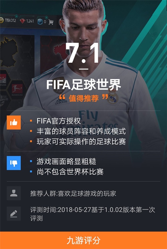 六月足球季,燃情一夏天。刚刚开启的世界杯大战可谓就是战火熊熊,首场东道主俄罗斯便斩下了5比0的惊人比分,随后的西葡大战中,C罗更是上演惊天神技,凭借帽子戏法逆转逼平西班牙。 而在虚拟足球世界,也是同样精彩,由FIFA正版授权的《FIFA足球世界》手游正式上线,借着世界杯的东风,九游评分给诸位足球迷带来第一手新鲜的游戏评测资讯。 这款游戏凭借创新玩法以及强竞技性,在九游专家评分中获得了7.1分,但游戏画质以及操控性成为其获取高分的障碍。 养成与竞技并举,打造实战联盟 九游测评认为丰富的球员阵容和养成模式是《FIFA足球世界》的一大亮点,此次推出的游戏,并没有选择走EA传统的模拟经营路线,而是为玩家提供了球员养成、在线竞技等一些更具实战意义的内容,从真实度上能够满足球迷玩家的需求。在《FIFA足球世界》中,玩家可以任意选择征战五大联赛,并选择从低级联赛到超级联赛的不同球队,解锁球队队员。 因为拥有FIFA官方授权,游戏内加入了不少真实存在的足球巨星,并且加入了养成模式。经九游测评,玩家可以操控俱乐部球星,通过训练和球员天赋选择等模式来进行深度养成并进一步提升实力。在球星的养成上,《FIFA足球世界》更多是以卡牌玩法进行展现,通过前期的培养,使得球员不断地提升品质与属性。 将自己喜欢的球员打造成首屈一指的世界级球星,这对于忠实足球粉丝来说,具有极大的吸引力。