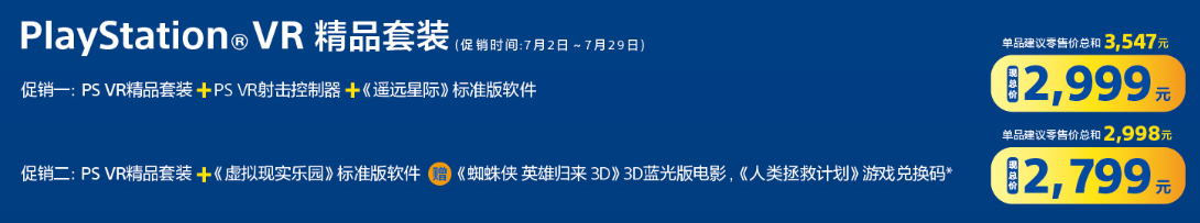 索尼互动娱乐(上海)有限公司今日宣布,将于2018年6月29日开始陆续展开PlayStation暑期特惠活动,包括PlayStation 4 Pro、PlayStation 4 Slim、PlayStation VR均有不同优惠,活动截止日期为7月29日,具体活动信息如下: PlayStation 4 Pro“优惠套装” PlayStation 4 Pro“优惠套装”一包含PlayStation 4 Pro一台、《NBA 2K18》游戏光盘一张,单品建议零售价总和为3,298元人民币,促销活动价3,099元人民币。 优惠套装二包含PlayStation 4 Pro一套、《真·三国无双8》游戏一张,单品建议零售价总和为3,348元人民币,促销活动价3,199元人民币。 此外,从7月2日起在京东自营PlayStation官方旗舰店发售的优惠套装包含PlayStation 4 Pro一套、DUALSHOCK?4无线控制器一个、《街霸V 入门版》游戏一张,单品建议零售价总和为3,578元人民币,促销活动价为3,249元人民币。 *以上活动将在京东自营PlayStation?官方旗舰店进行。 PlayStation?4“大作套装” 活动期间将推出PlayStation 4“大作套装”,包含新版PS4TM(500GB,黑色/冰河白)主机一台、《街霸 V入门版》游戏光盘、《地平线 零之曙光》游戏光盘、《小小大星球3》游戏兑换码以及PlayStation Plus三个月会员兑换码,建议零售价为2,199元。 *以上活动将在PlayStation官方核心店、PlayStation官方优选店、顺电、PlayStation天猫官方旗舰店、索尼天猫官方旗舰店、PlayStation天猫官方授权店、京东自营PlayStation官方旗舰店、PlayStation京东官方授权店、索尼中国直营店、索尼中国在线商城进行。 PlayStation?VR“优惠套装” 从7月2日将推出PlayStation VR“优惠套装”,数量有限,先到先得。PlayStation?VR优惠套装一包含PlayStation VR一套、PlayStation VR射击控制器一个、《遥远星际》游戏一张,单品建议零售价总计为3,547元,促销活动价为2,999元人民币。 *以上活动将在PlayStation官方核心店、PlayStation官方优选店、顺电、PlayStation天猫官方旗舰店、索尼天猫官方旗舰店、PlayStation天猫官方授权店、京东自营PlayStation官方旗舰店、PlayStation京东官方授权店、索尼中国直营店、索尼中国在线商城进行。 优惠套装二包含PlayStation VR一套、《虚拟现实乐园》游戏一张、《人类拯救计划》游戏下载码一个、《蜘蛛侠:英雄归来》电影3D蓝光版(赠),单品建议零售价总和为2,998元人民币,促销活动价2,799元人民币。 *以上活动将在PlayStation官方核心店、PlayStation官方优选店、顺电、PlayStation天猫官方旗舰店、索尼天猫官方旗舰店、PlayStation天猫官方授权店、京东自营PlayStation官方旗舰店、PlayStation京东官方授权店、索尼中国直营店、索尼中国在线商城进行。 纷繁夏日,优惠加倍。有PlayStation?陪伴的暑期注定不会孤单,各位玩家朋友们准备好畅享属于你的暑期游戏之旅了吗? |